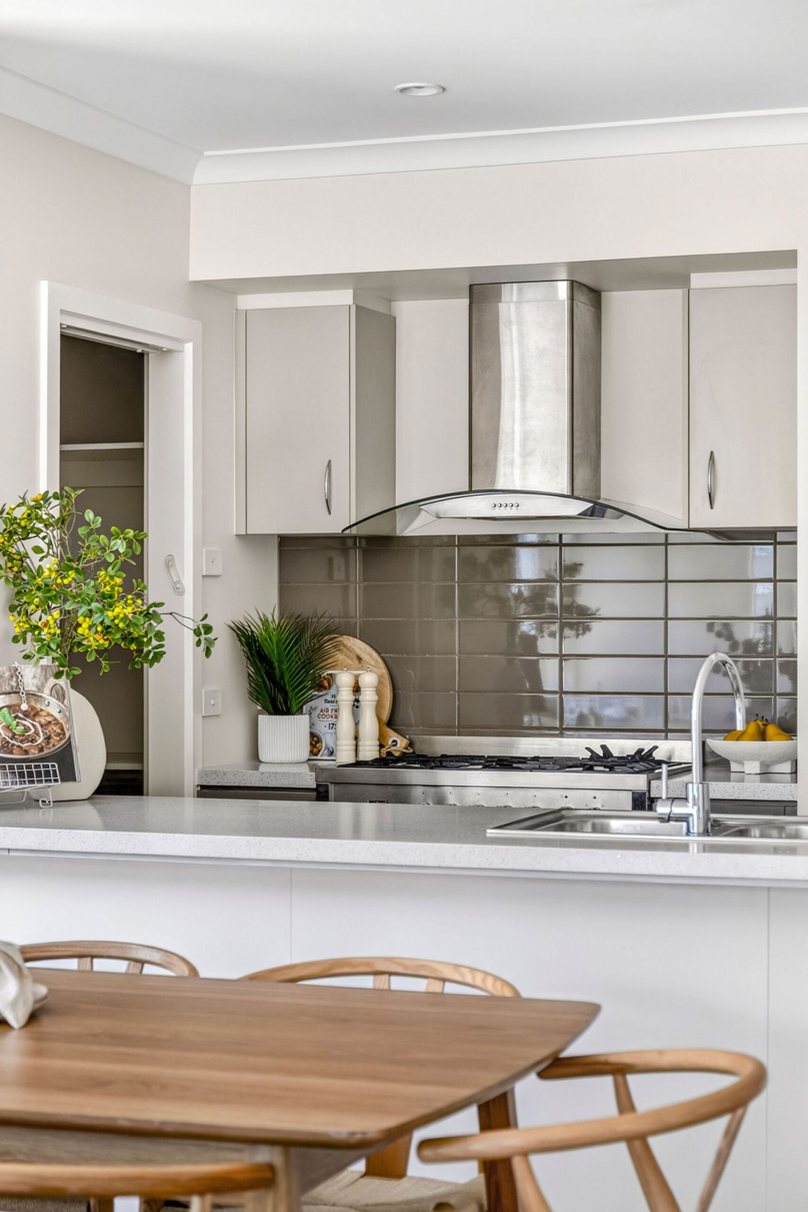 Kitchen- 40mm stone benchtops, breakfast bar overhang, dual sinks, large walk-in pantry with cavity slider door, 900mm gas oven/cooktop & rangehood, overhead cabinetry, tile splashback, timber laminate flooring, fridge cavity, microwave provision, downlights, dishwasher, chrome fittings