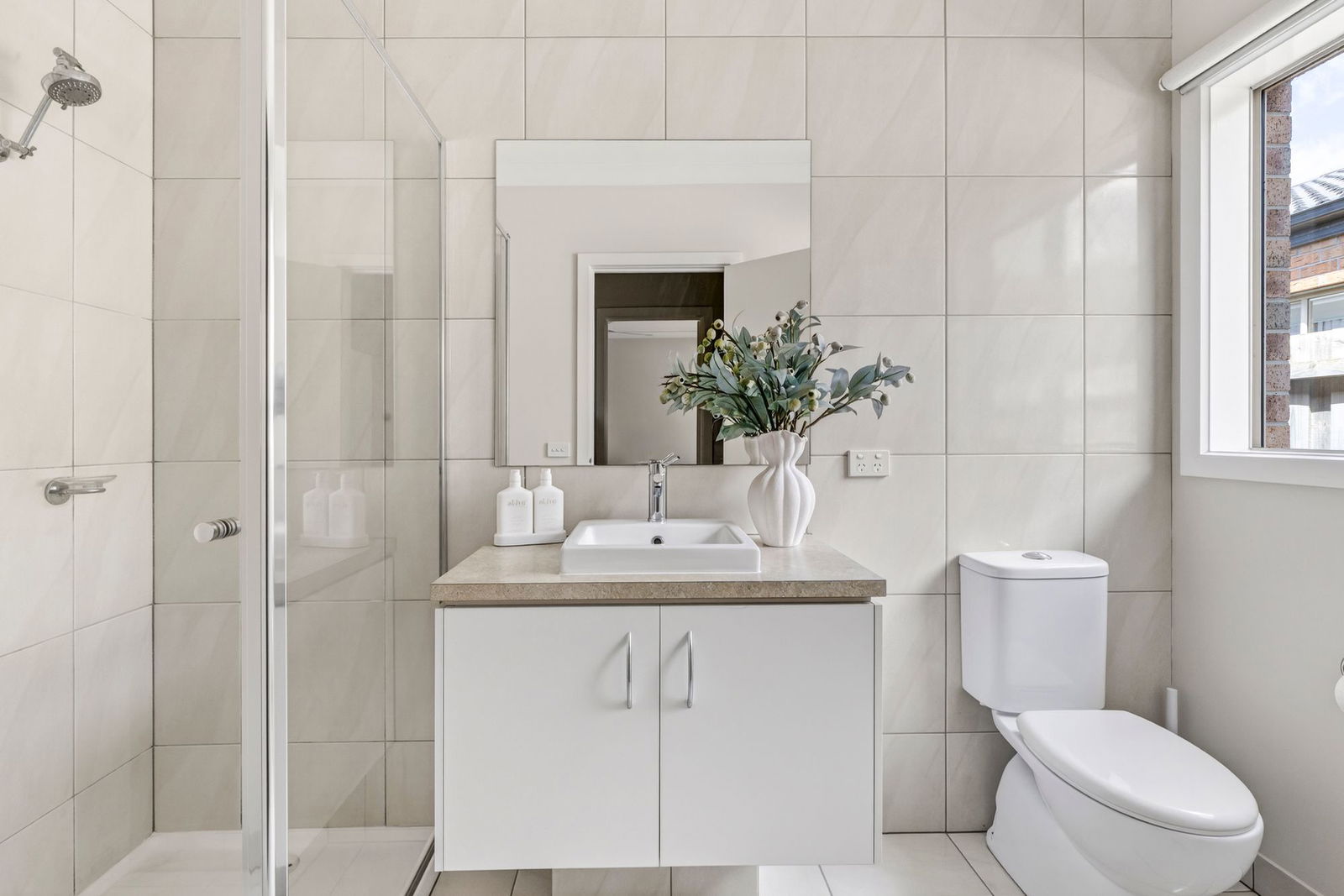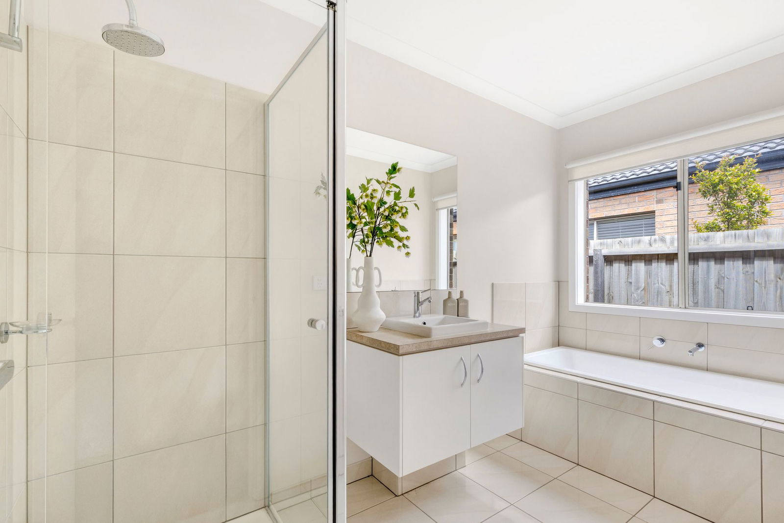 Main Bathroom- single vanity & basin with storage, semi-frameless shower and bath tub, separate toilet, double towel rail, roller blind, chrome fittings