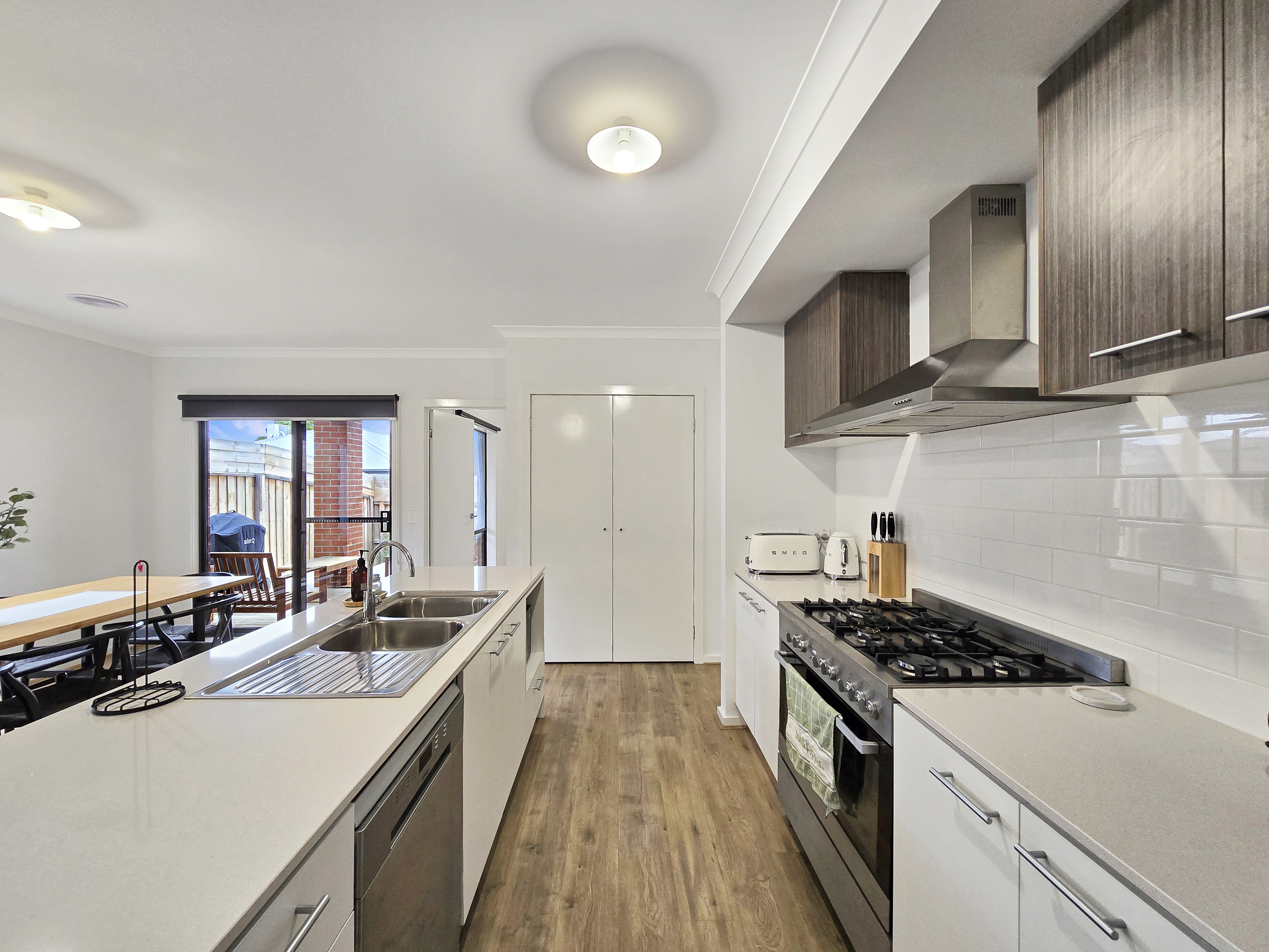 – Kitchen including 900mm stainless steel oven, 5 burner gas cooktop, dishwasher, stone bench tops and built-in pantry