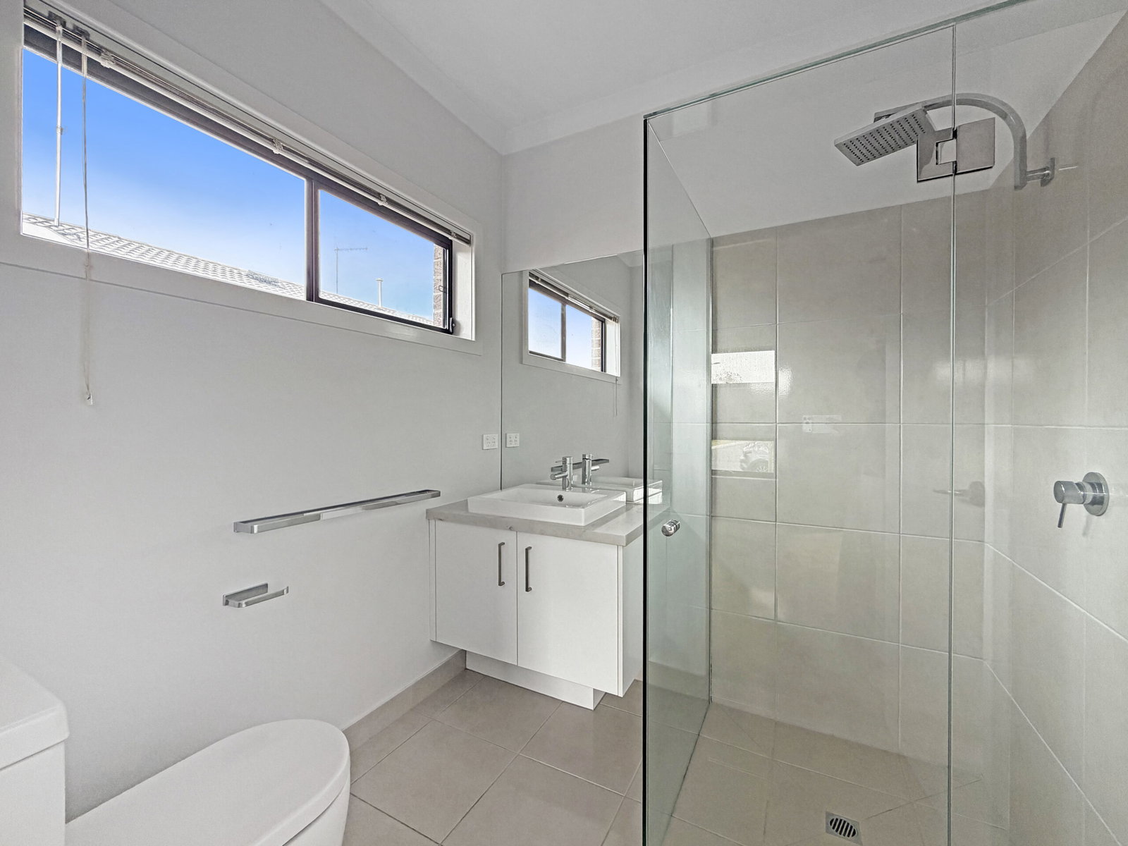 Ensuite – Beautifully appointed with a semi-tiled shower featuring a waterfall showerhead, a 40mm stone benchtop with a sleek single basin, mirrored splashback, chrome tapware, towel rail, and toilet – offering style and functionality.