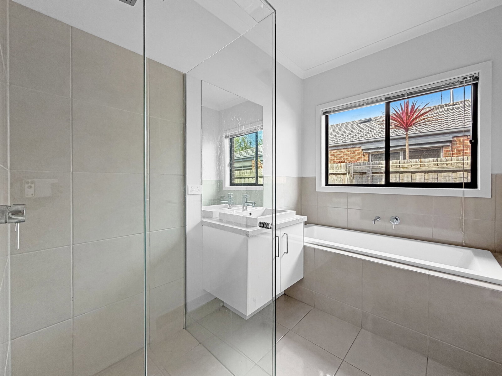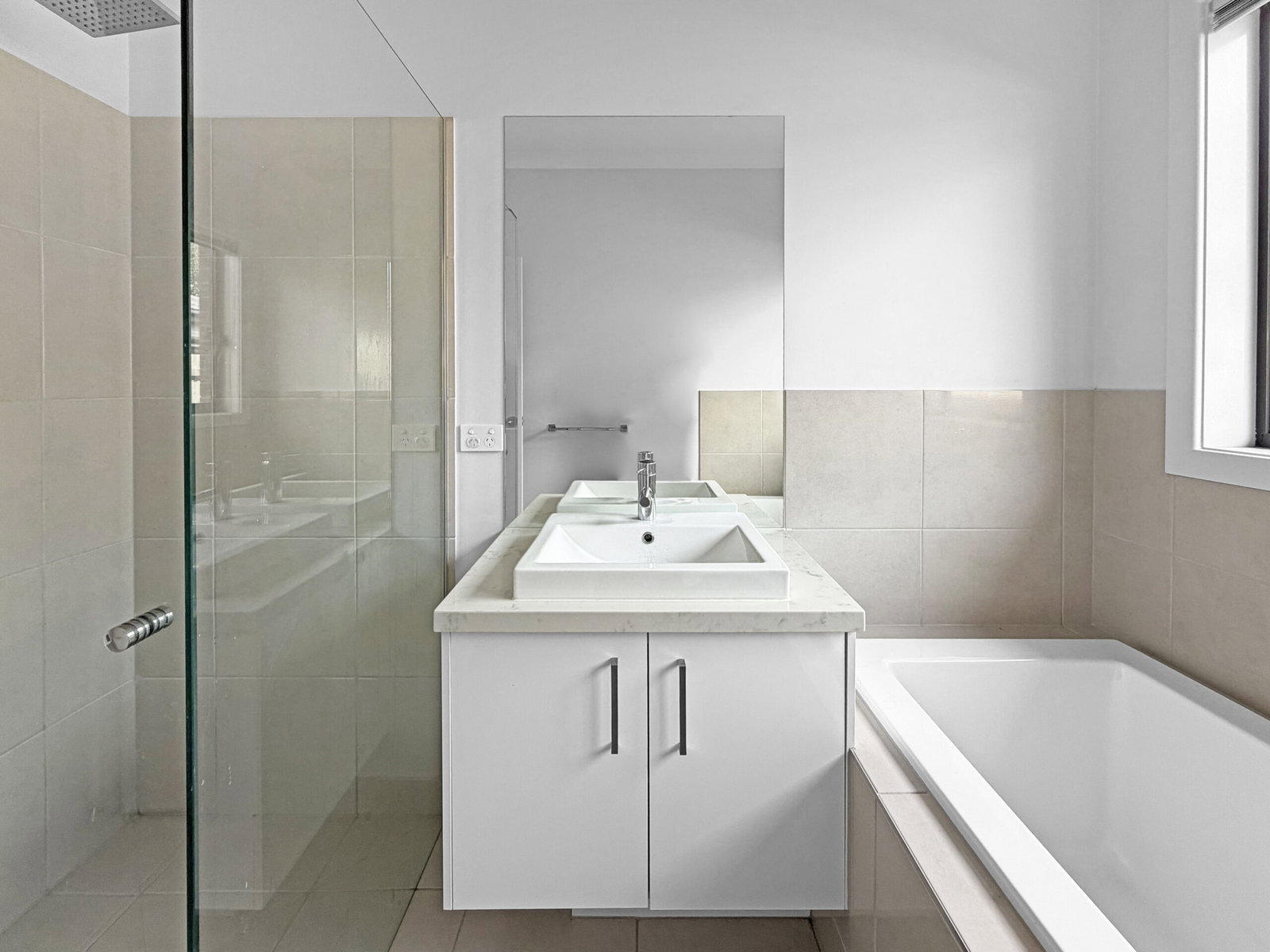 Main Bathroom – Thoughtfully finished with a semi-tiled shower and waterfall showerhead, 40mm stone benchtop with single basin, mirrored splashback, chrome tapware, towel rail, bathtub, and a separate toilet for added convenience.