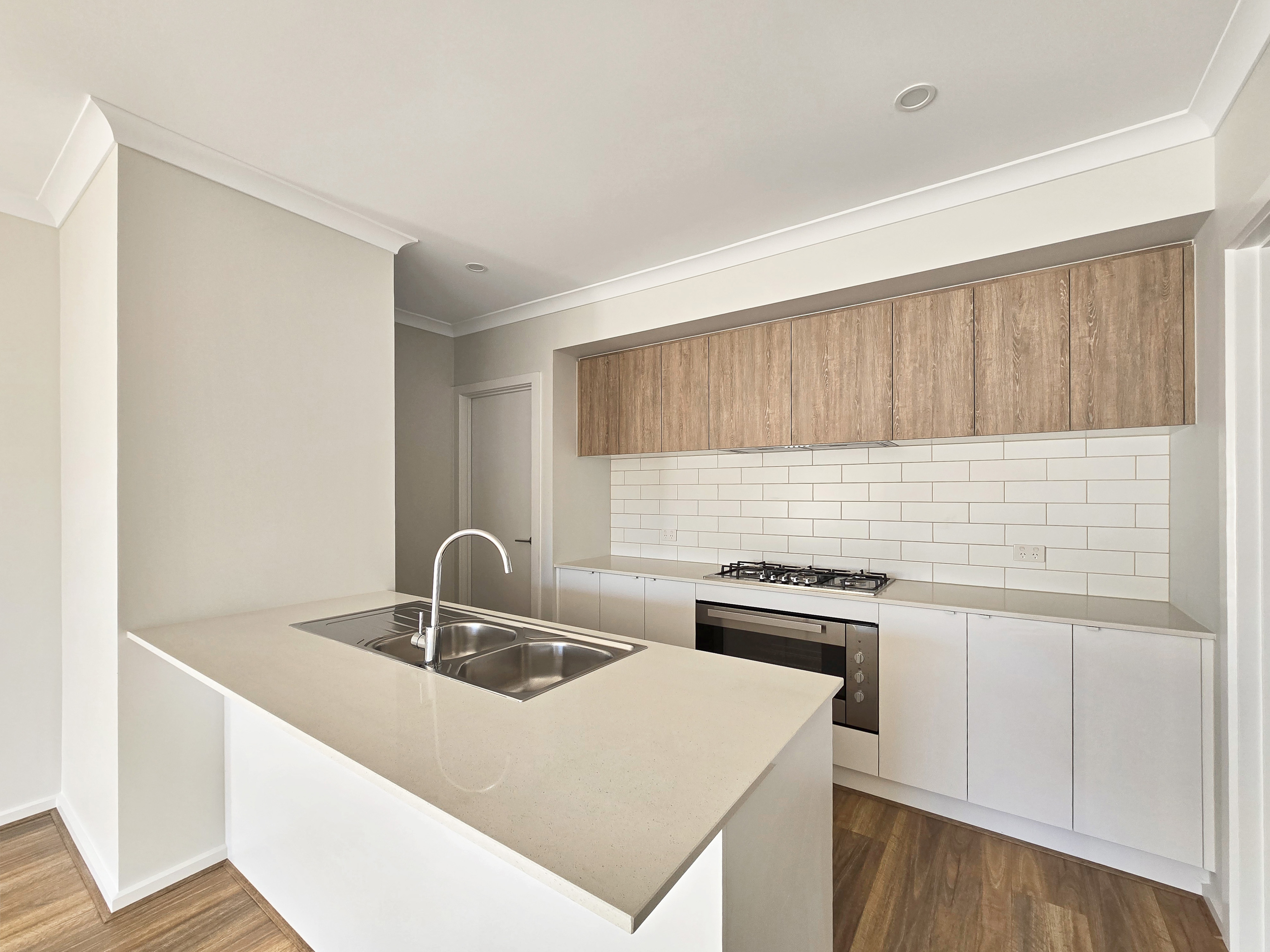 – Stylish and well equipped modern kitchen with stone bench-tops, tiled splash-back, 900mm stainless steel oven and 5 burner gas cook top, dishwasher and pantry
