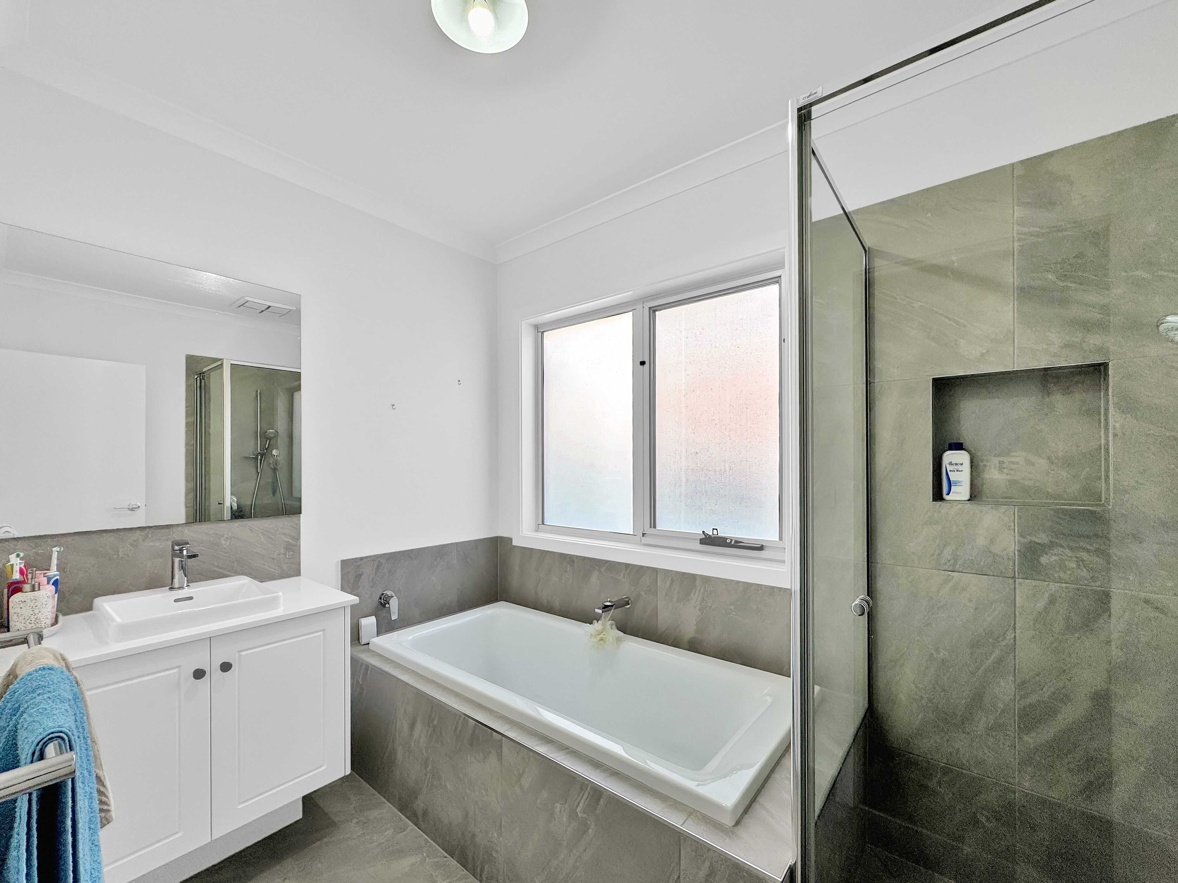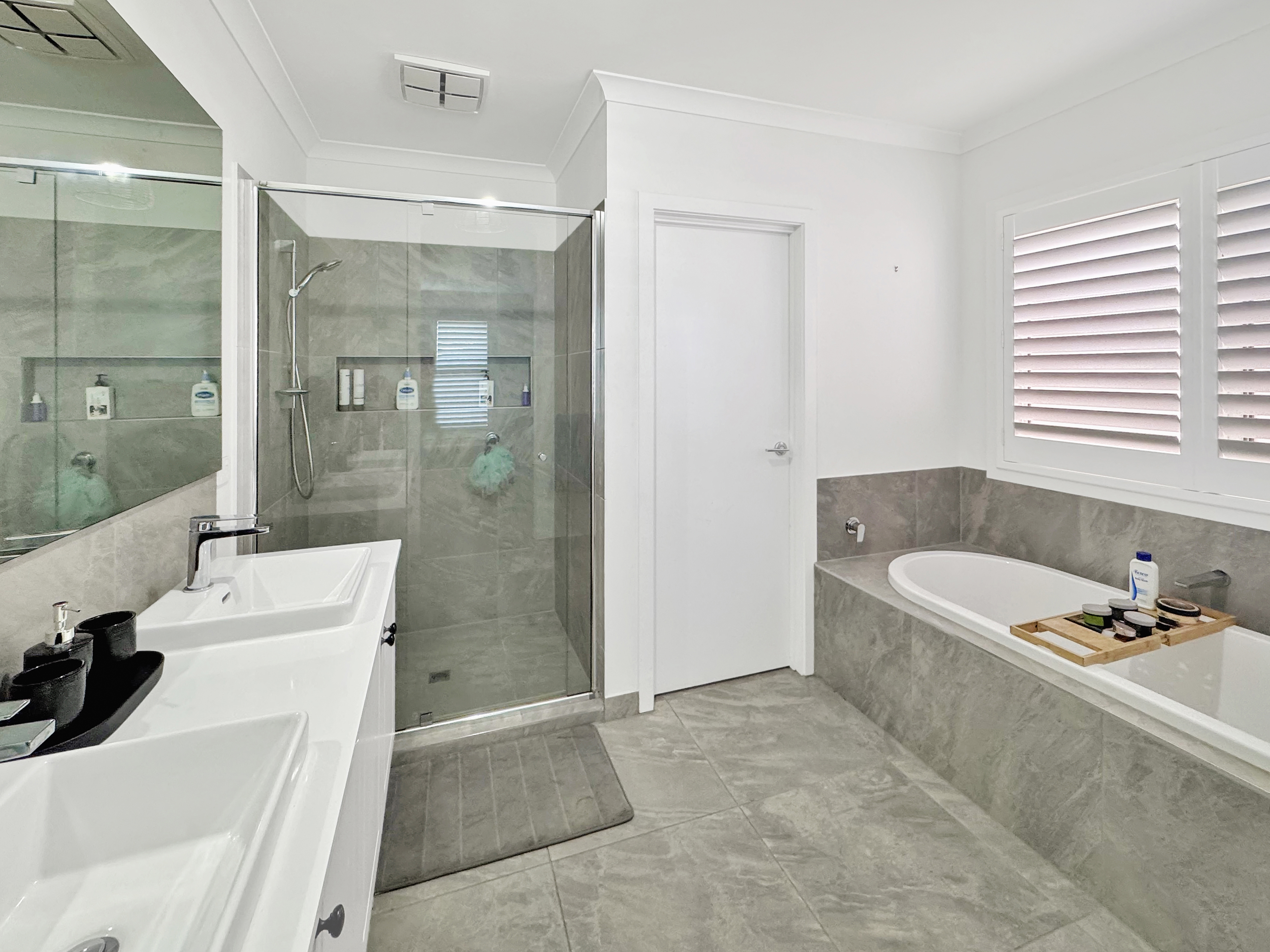 Main bathroom – Tiled, 20mm stone benchtop, single basin and vanity, mirror splashback, semi frameless, shower niche, chrome fittings, bath, frosted window.
