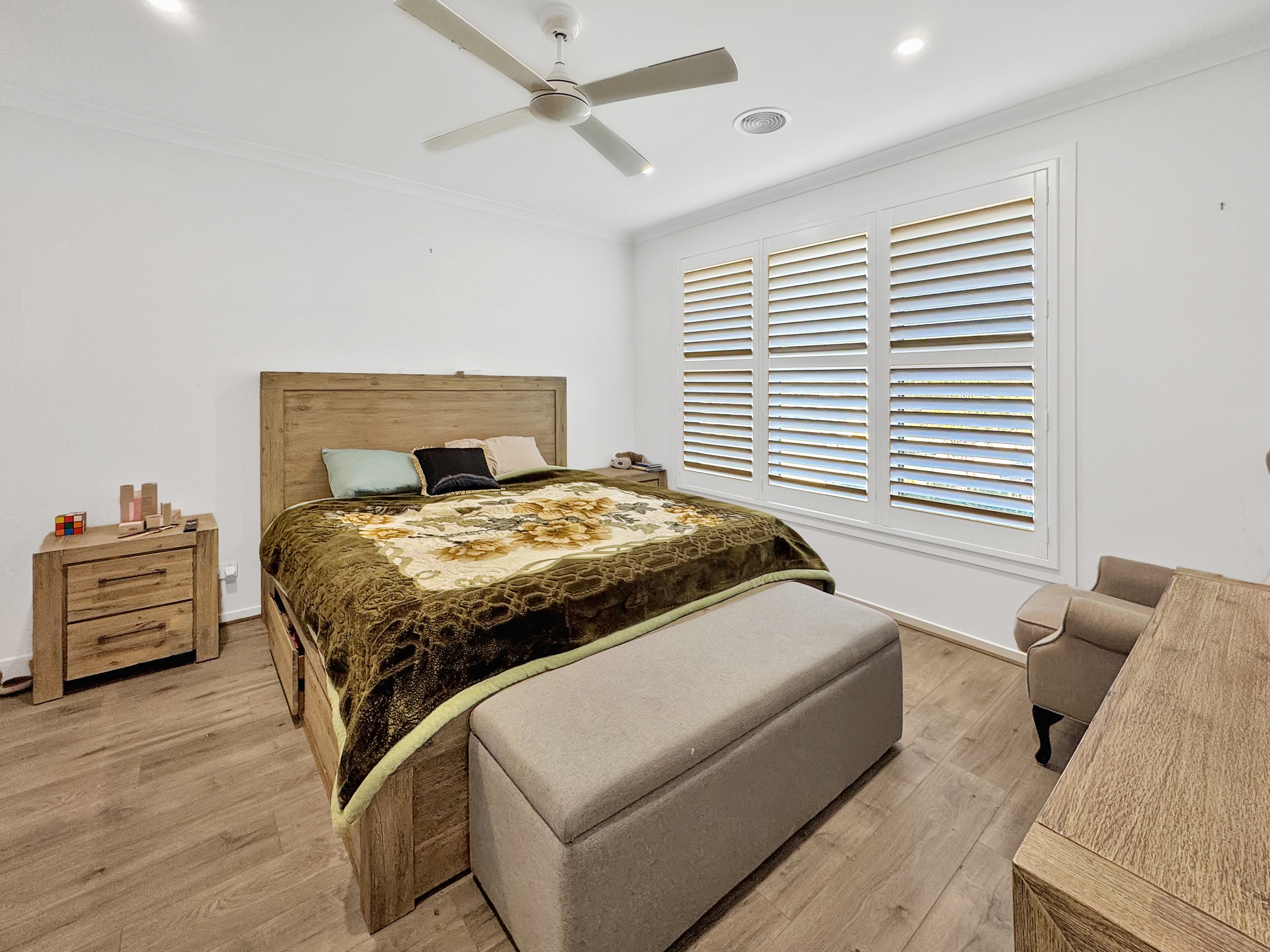 Master Bedroom – Spacious, timber laminate flooring, downlights, ceiling fan, ducted heating, evaporative cooling, walk in robes with hanging rails and shelving, double glazed window. Ensuite; feature tiles, 20mm stone benchtop, twin basin and vanity with storage, tile splashback, downlights, semi frameless shower, bath, chrome fittings, toilet, frosted window with shutters, shower niche,