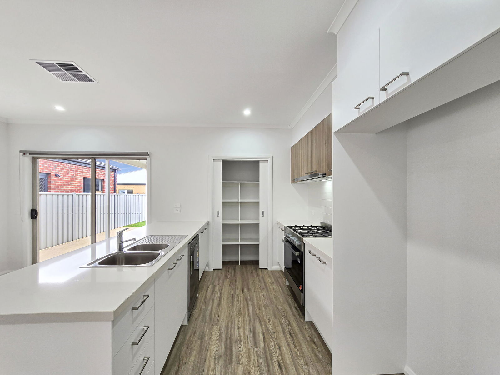 – Stylish and well equipped modern kitchen with stone bench-tops, tiled splash-back, 900mm stainless steel oven and 5 burner gas cook top, dishwasher and a large pantry
