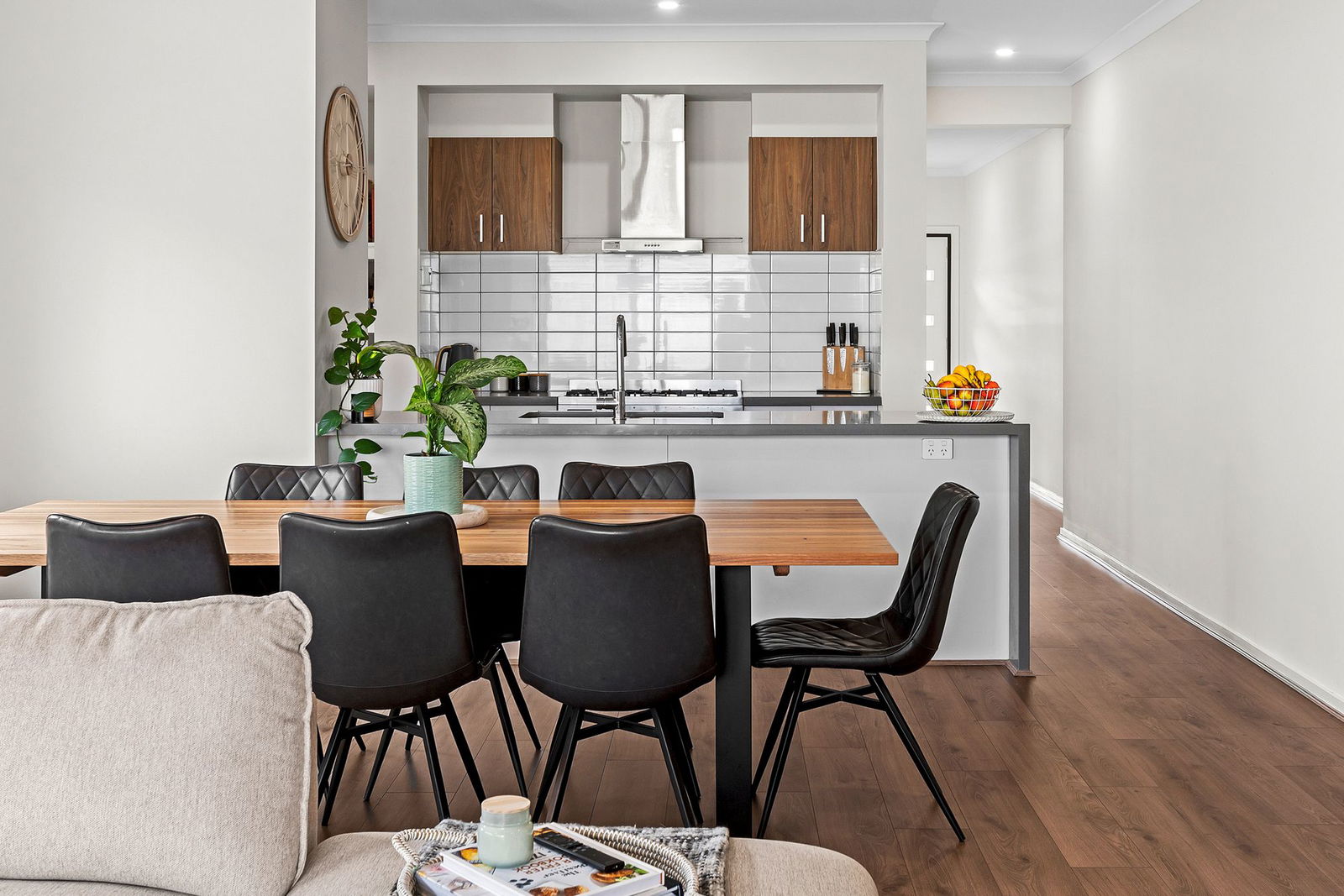 Kitchen: The heart of the home features 40mm stone benchtops with a waterfall edge, a 900mm gas stovetop and oven, built-in microwave, dishwasher and dual undermount sink. Enjoy ample storage with overhead and underbench cabinetry, plus a spacious walk-in pantry with a large fridge cavity and double-glazed awning window. Highlighted by sleek downlights and hybrid timber-look flooring, this kitchen seamlessly blends elegance with everyday practicality.