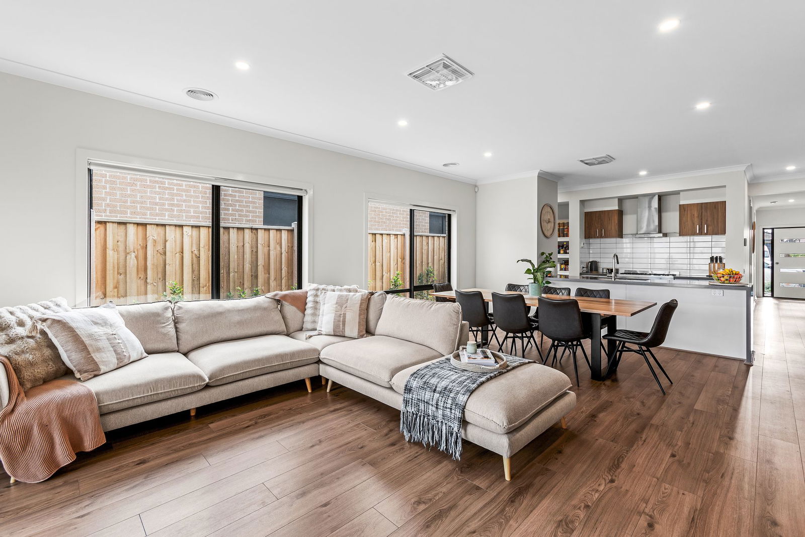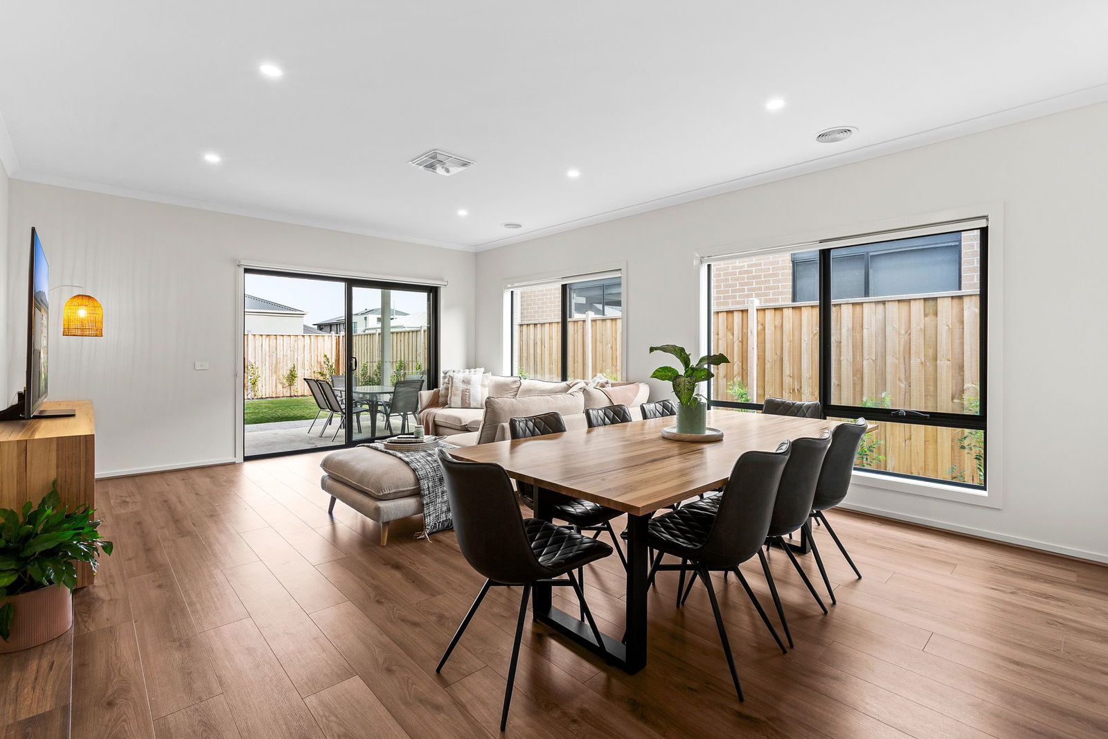 Open Plan Living/Dining: Designed to maximise space and light, the open plan living and dining area features wide double-glazed windows with blockout blinds, hybrid timber-look flooring, ducted heating and evaporative cooling. A double-glazed glass sliding door connects the space to the outdoor area, offering easy indoor-outdoor flow for relaxed entertaining.