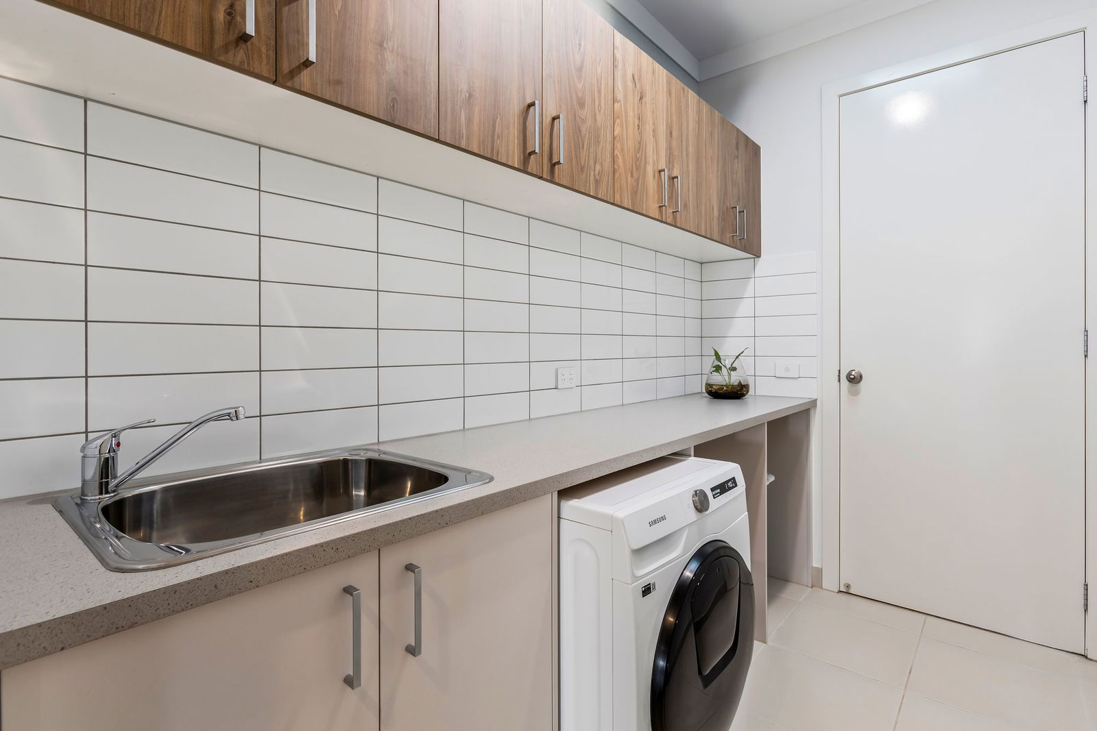 Laundry: Designed for practicality, the laundry includes a large benchtop with dedicated washing machine and dryer cavity, trough with underbench storage, tiled splashback, and wall-to-wall overhead cabinetry.
