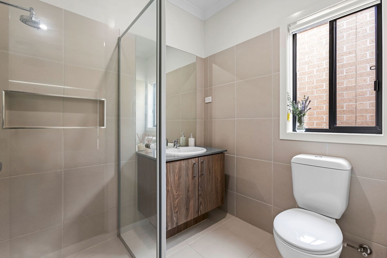Master Suite: A serene retreat featuring soft carpet underfoot, a walk-in robe, and a private ensuite. Comfort is ensured with ducted heating, evaporative cooling, downlights and double-glazed windows with roller blinds. The ensuite offers a semi-frameless shower with niche, chrome fittings and trims, a 20mm stone benchtop vanity with mirror splashback, and a double-glazed sliding window with blockout blind for both light and privacy.