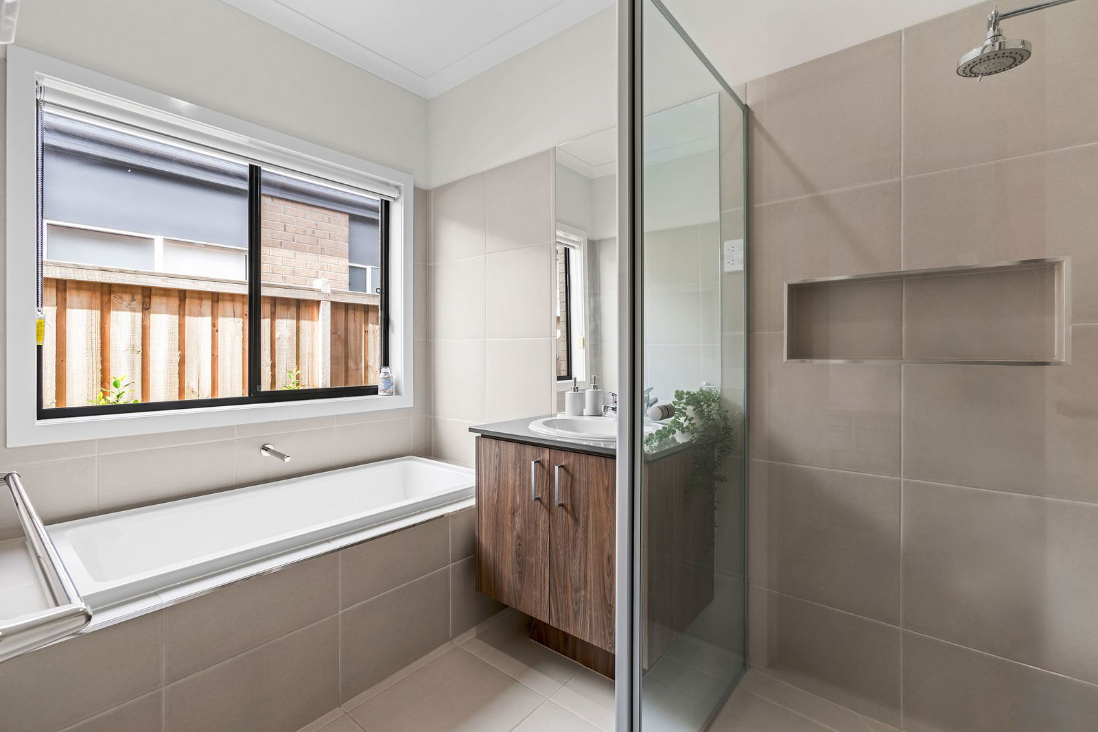 Additional Bathroom: A spacious and modern bathroom featuring a raised bath, a large shower with niche, 20mm stone benchtop vanity, chrome fittings and trims, and a double-glazed window with roller blinds for privacy and natural light.