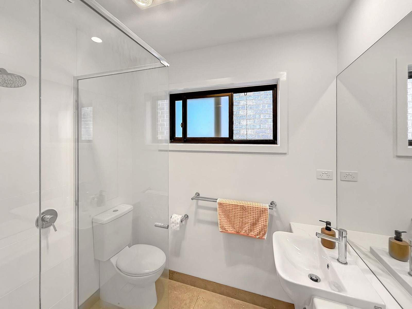 – Main bathroom with shower, single vanity and toilet.