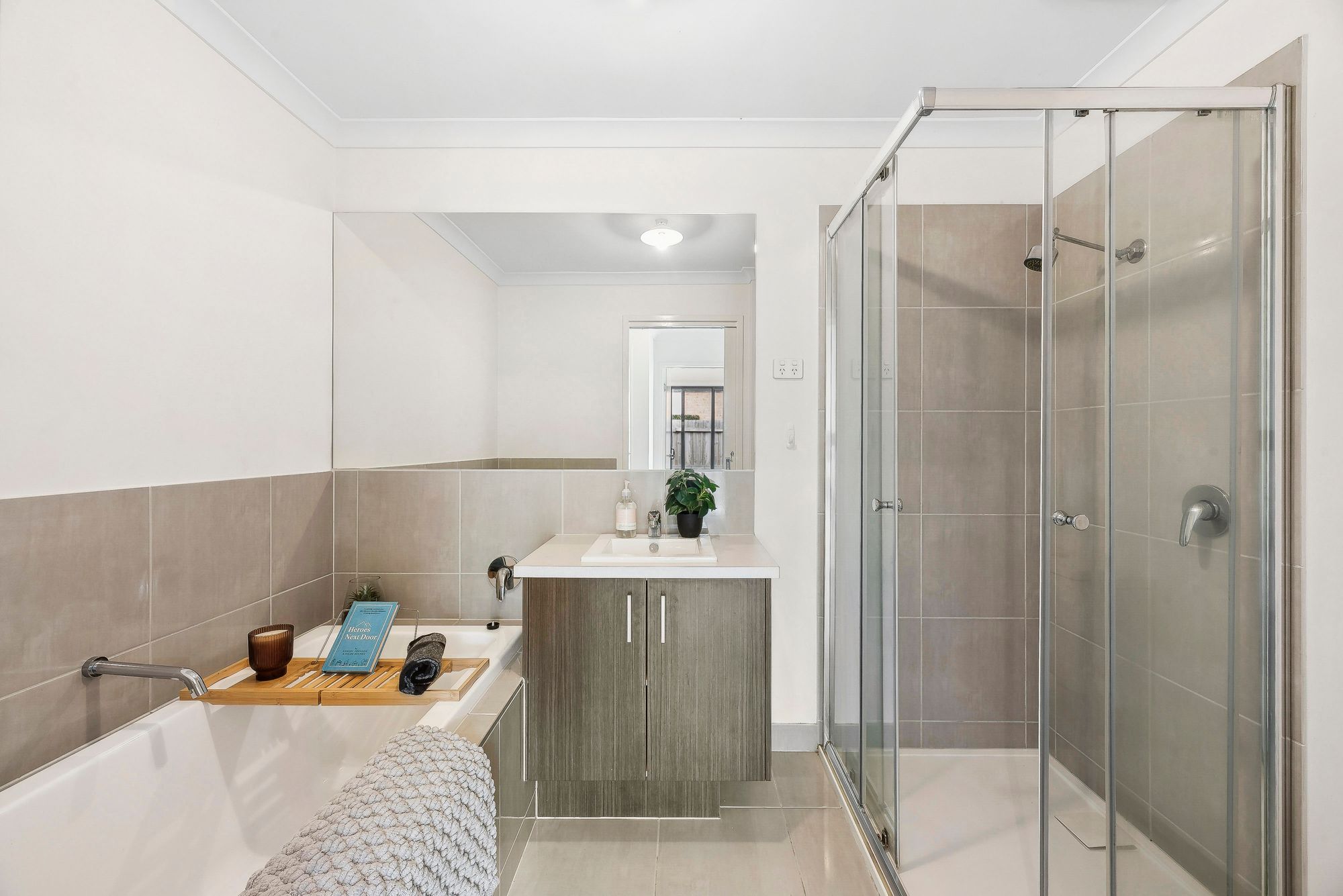 Main bathroom: tiled shower, bath, single basin and vanity, tile and mirror splash back, toilet