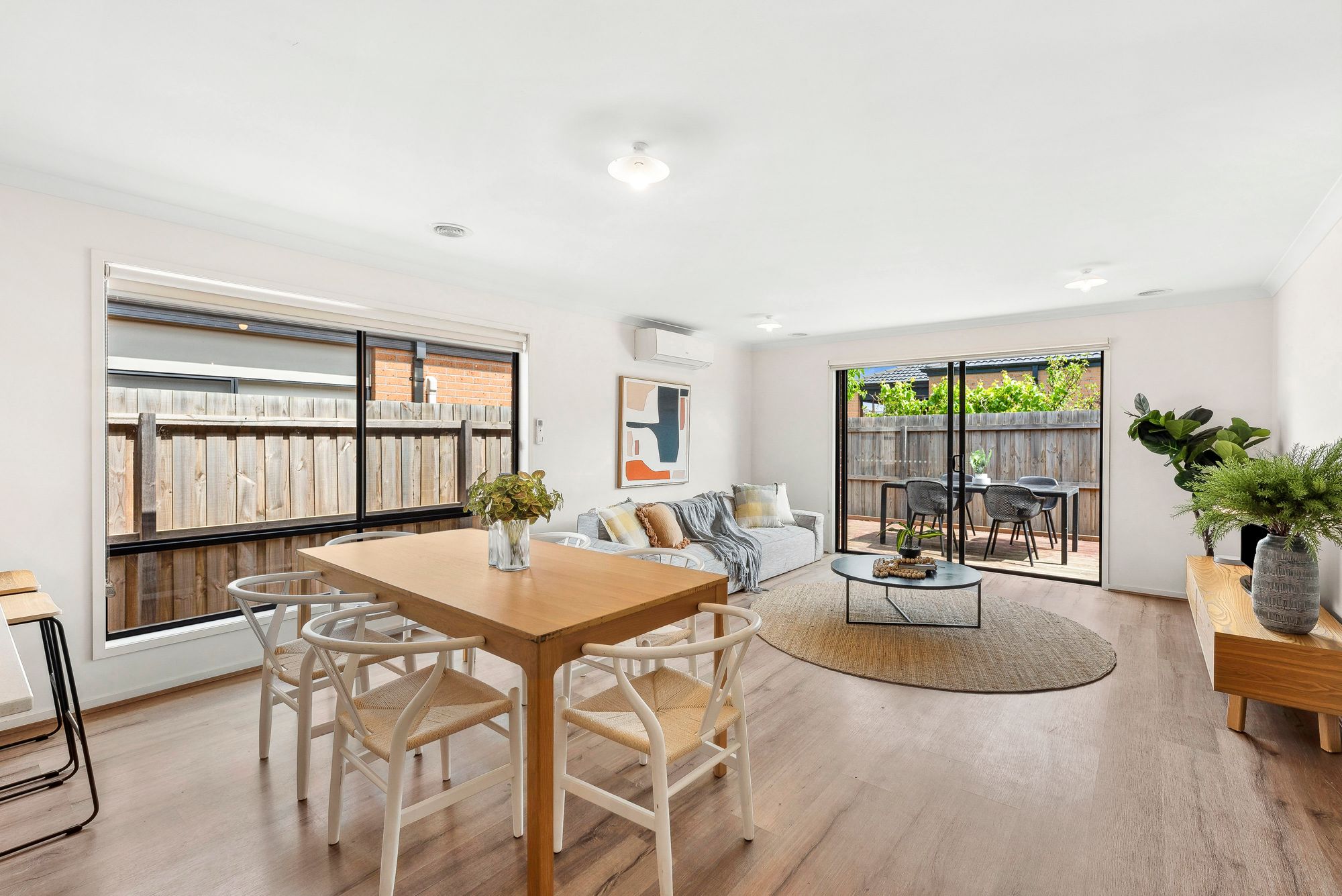 Living area: open plan kitchen/living/dining, timber laminate floorboards, ducted heating & split system cooling, roller blinds, sliding glass doors through to sun-exposed alfresco with decking