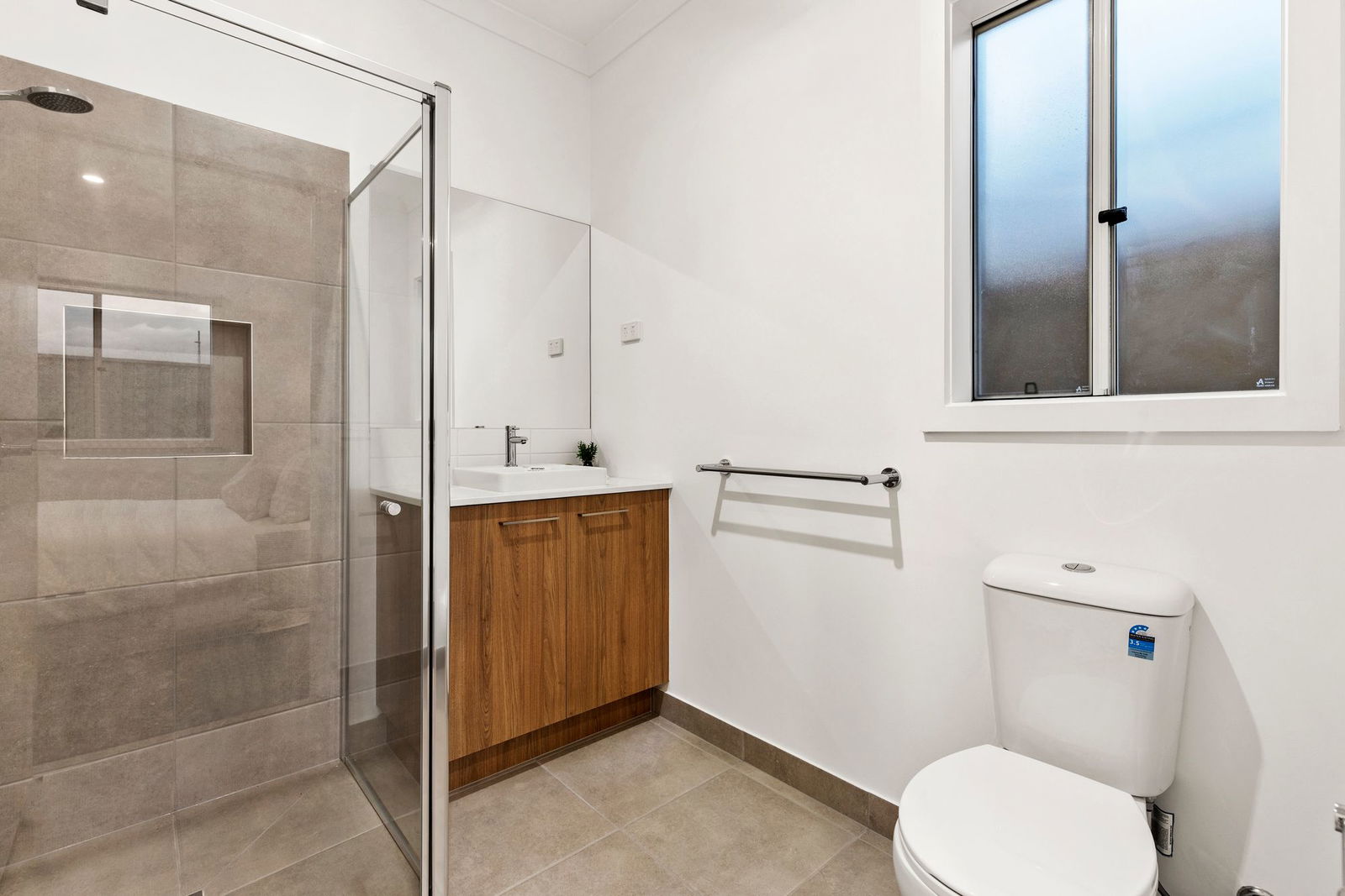 Ensuite – Large shower with wall mounted showerhead & shower niche, single sink on a 20mm stone benchtop vanity with ample storage, toilet, mirror splashback and chrome fittings.
