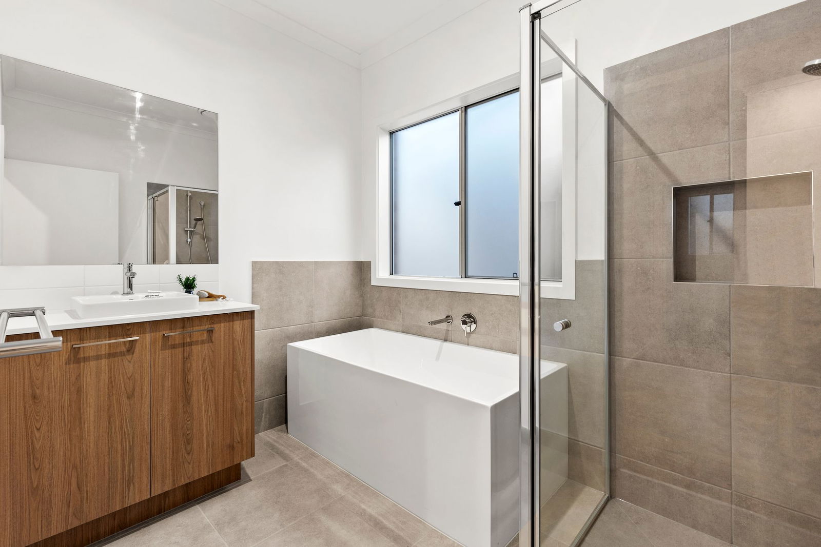 Main Bathroom – Shower with niche, free-standing bath, single sink and 20mm stone benchtop vanity with ample storage and chrome fittings, frosted window.