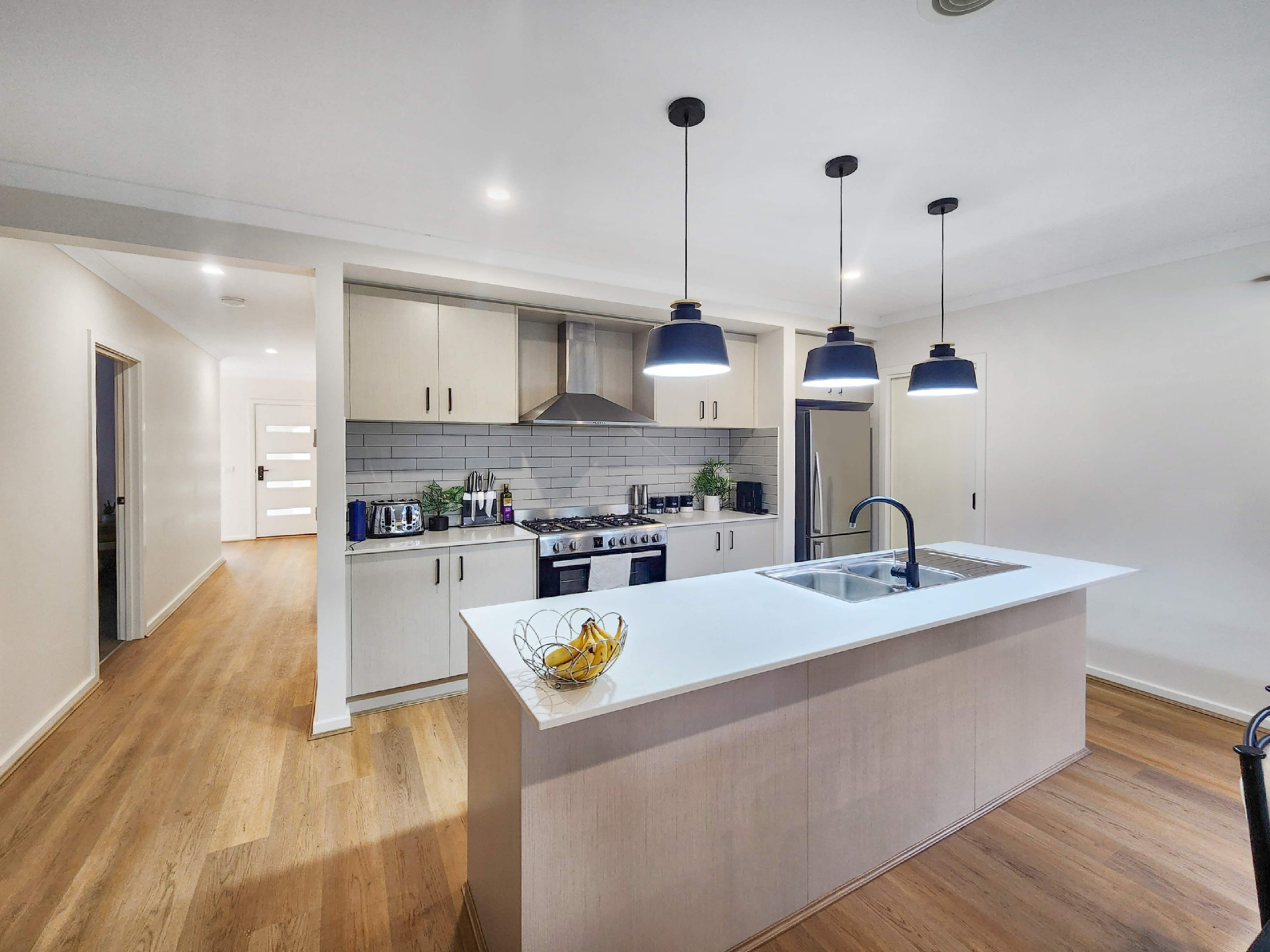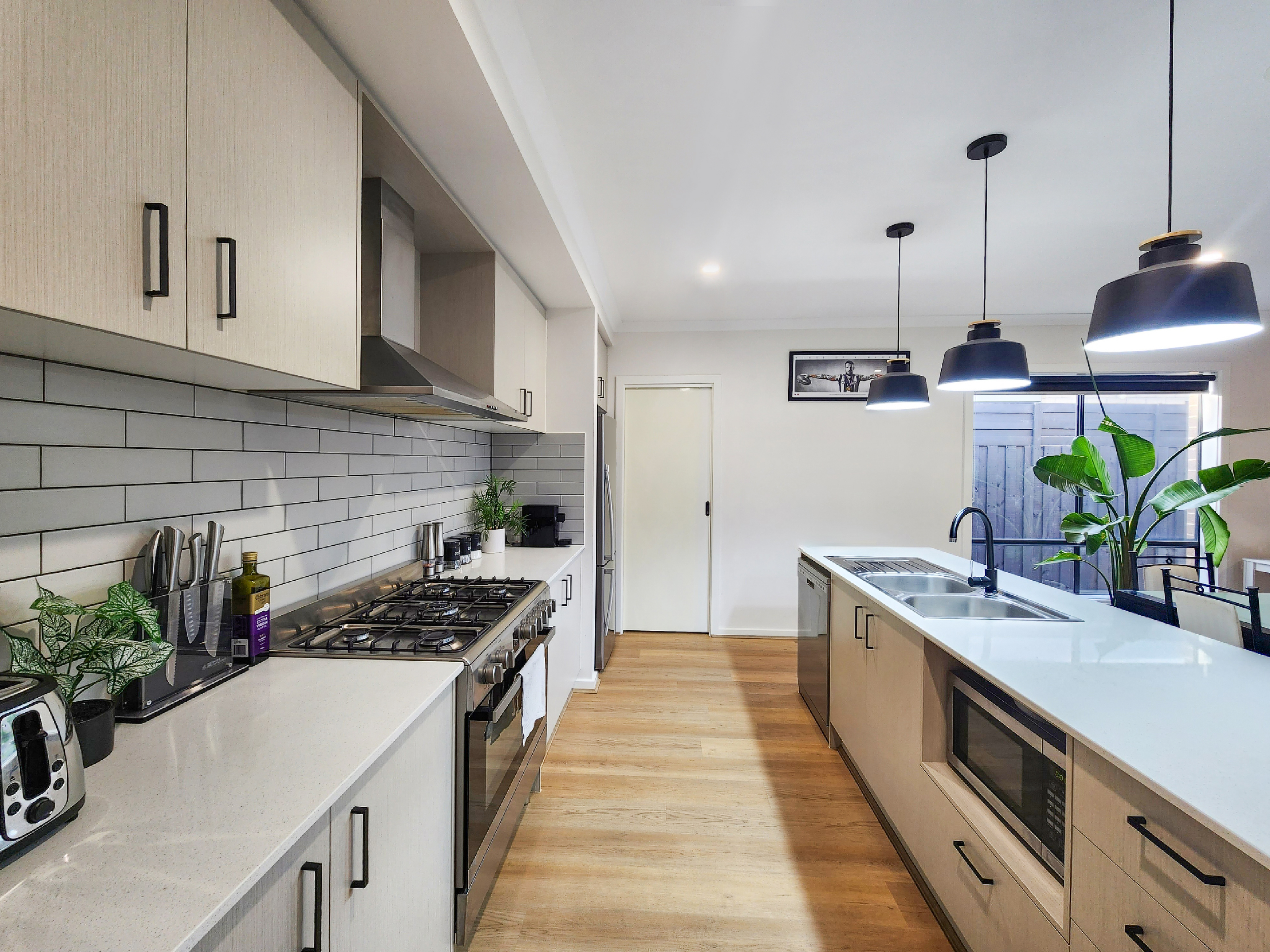 – The kitchen has a large walk in pantry, a 5 burner gas cooktop, 900mm oven, microwave cavity and dishwasher