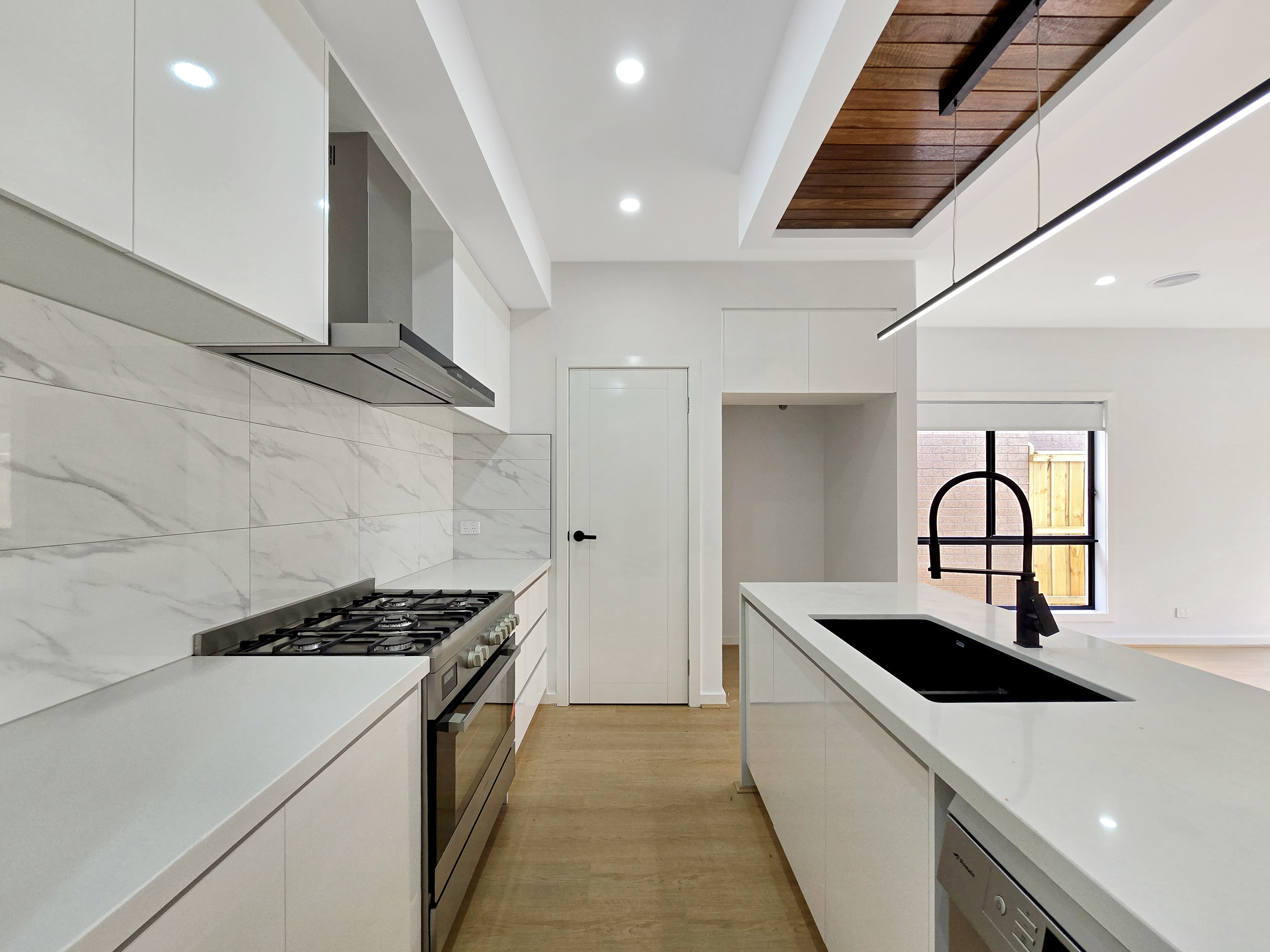 – Stunning kitchen with including pendant light, large walk-in pantry, stone waterfall bench-tops, plenty of cupboard space, and stainless steel appliances including 900mm oven, 5 burner gas cook-top and dishwasher