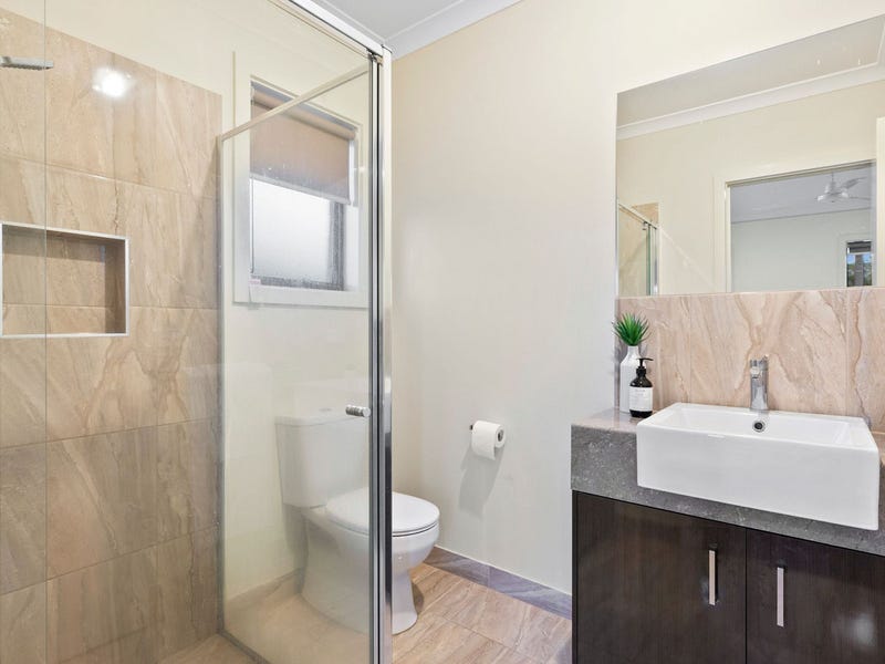 Master bedroom: carpet, roller blinds, down lights, ceiling fan. Ensuite: tiles, semi frameless shower, mirror splash back, toilet, stone benchtop, single basin and single vanity, roller blinds