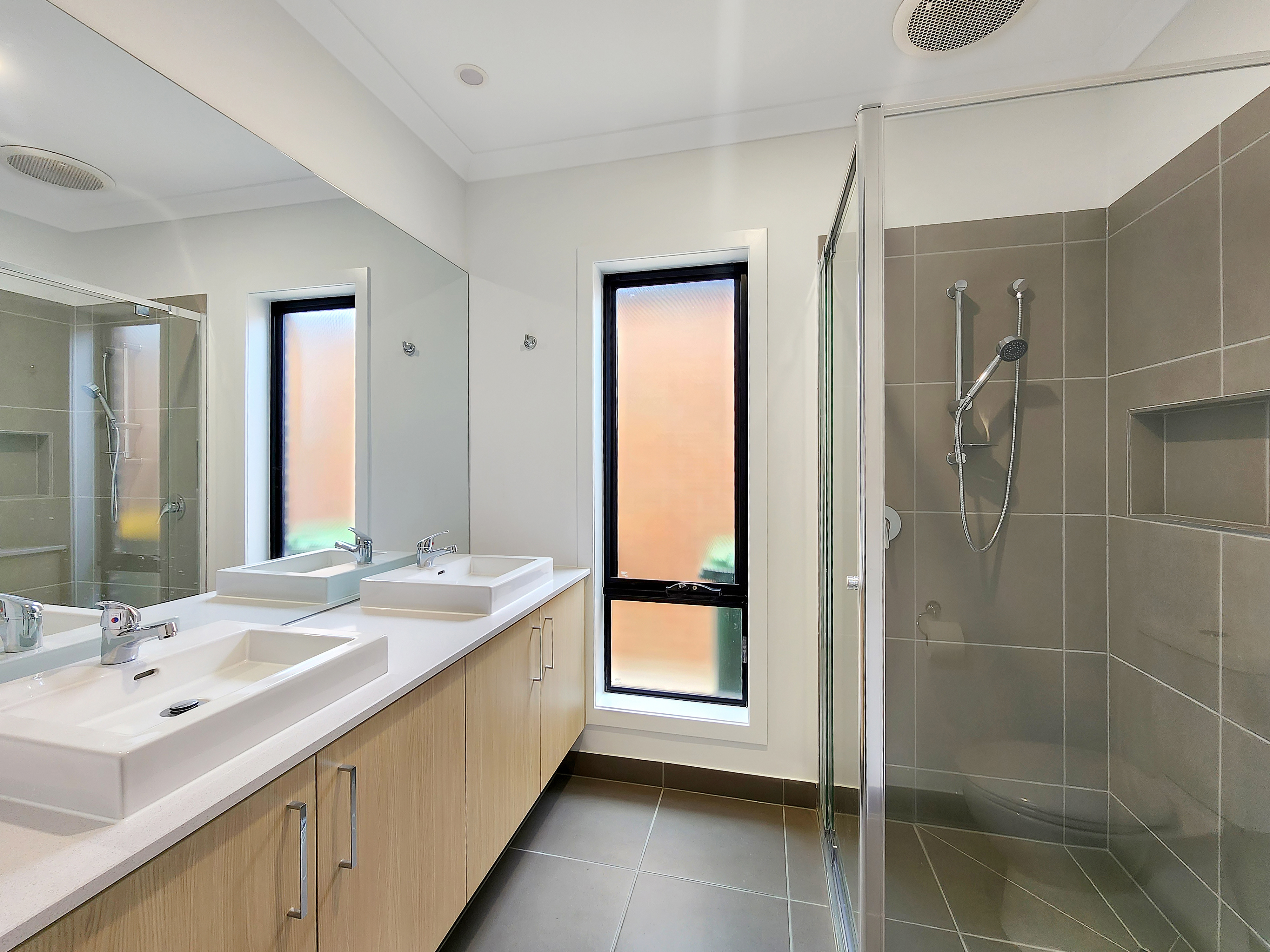 – Master bedroom including a ceiling fan, walk in robe and ensuite bathroom with a shower, double vanity and toilet