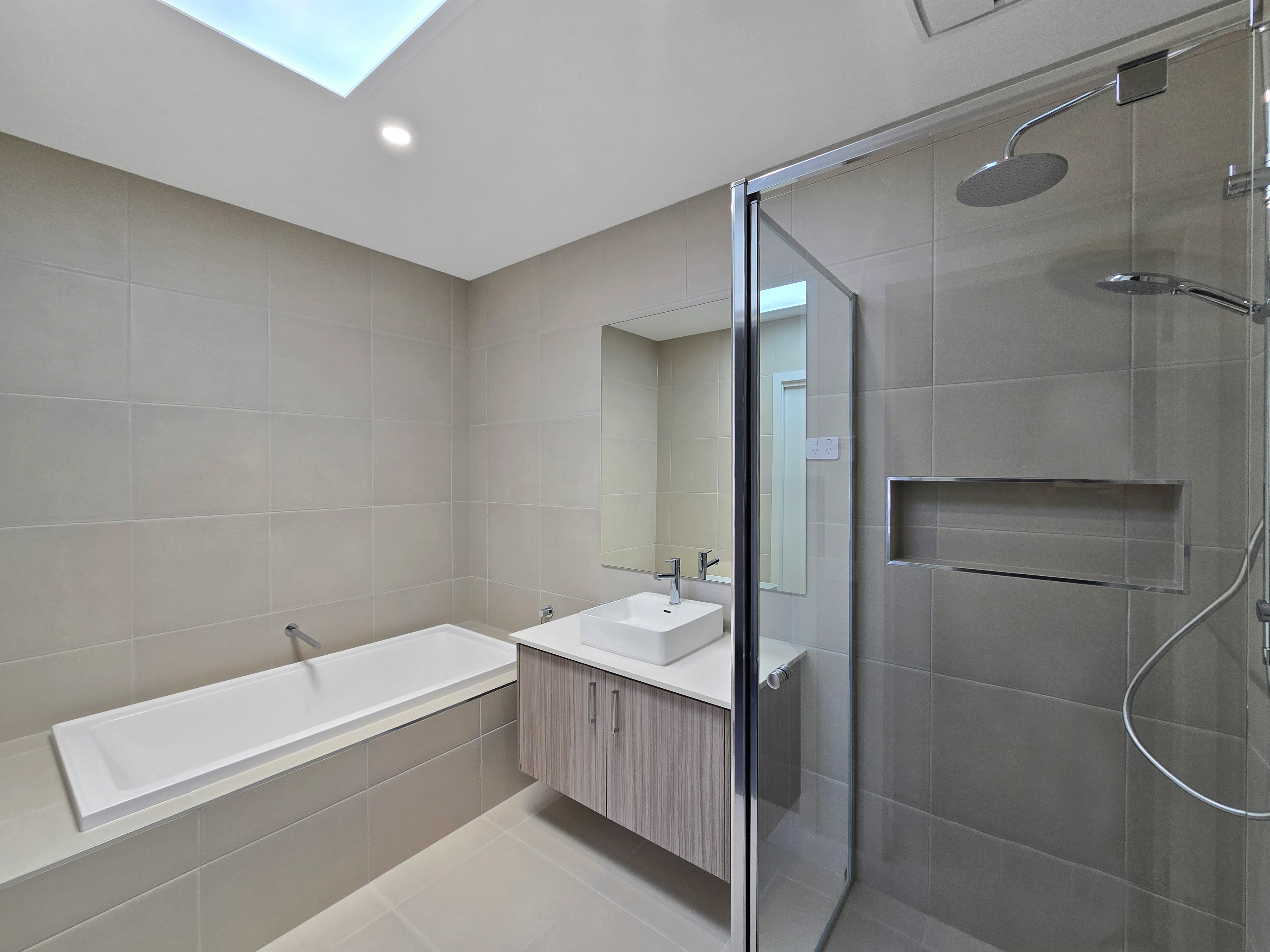 – A master bedroom with large walk-in robe, ceiling fan, and ensuite with double vanity, skylight, bath and shower with niche