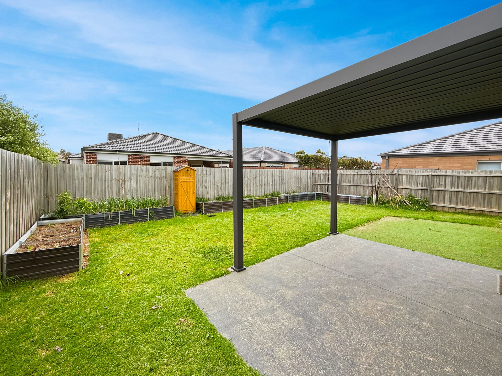 – Fully fenced low maintenance grassy backyard with alfresco area