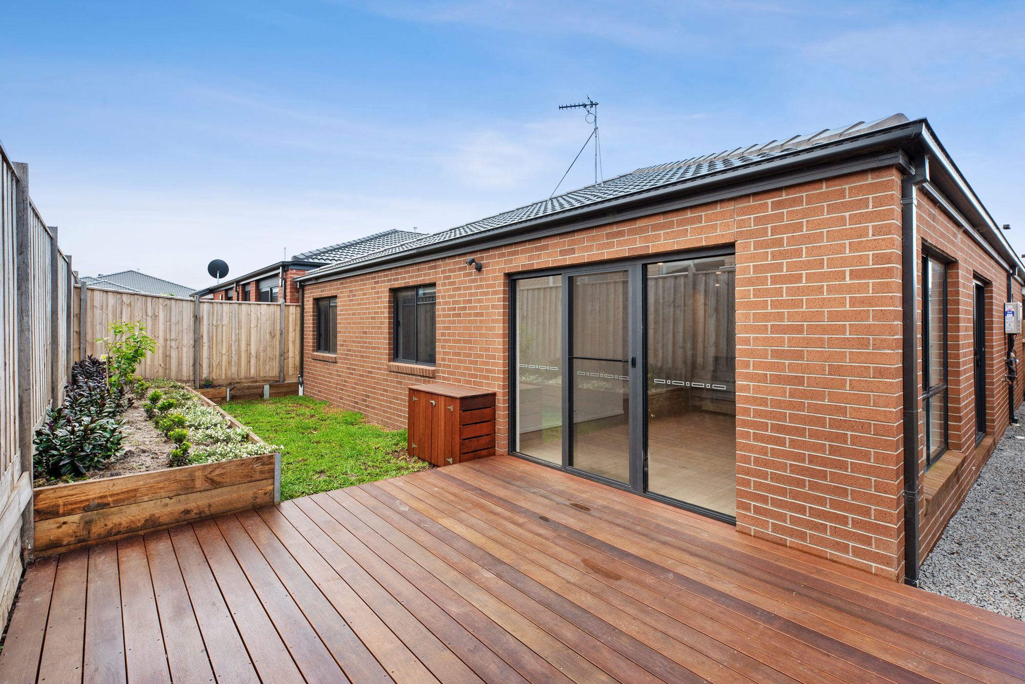 – Spacious deck, a grass space and low maintenance garden bed in the backyard.