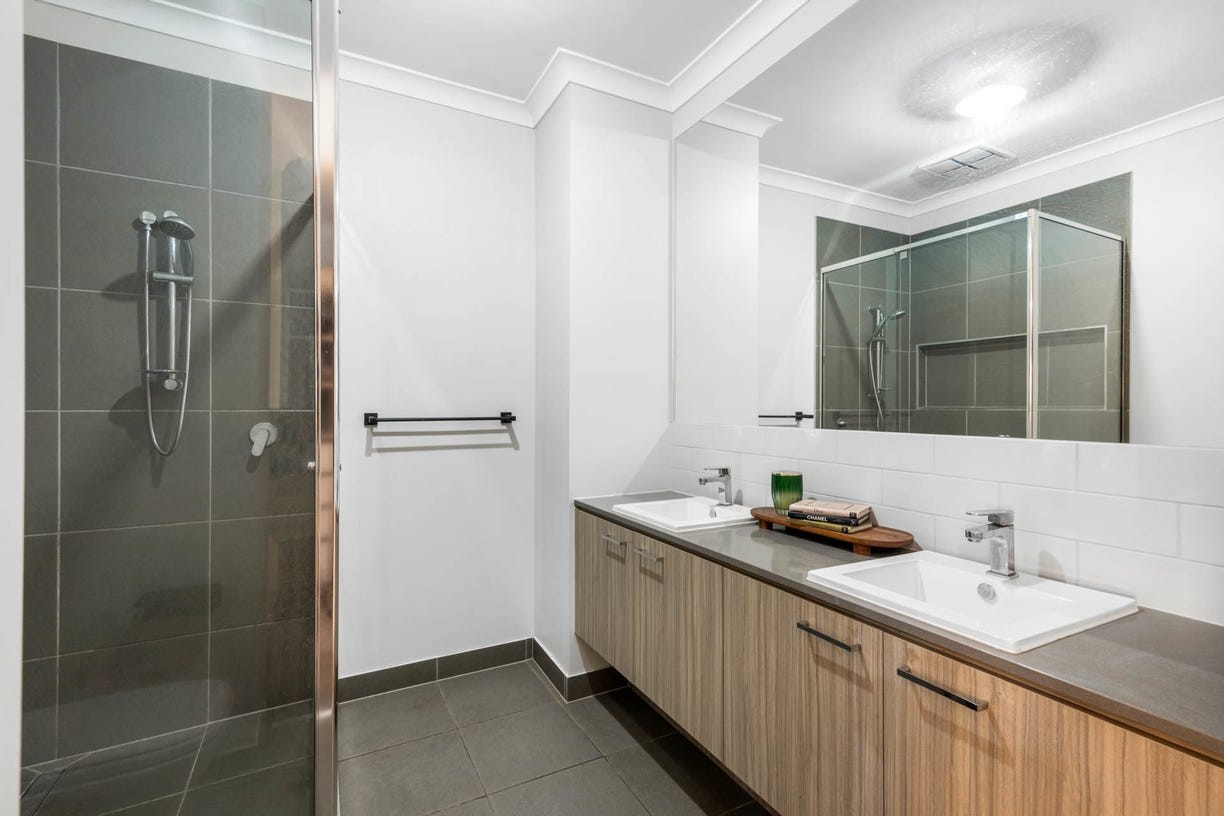 – Master bedroom featuring a walk-in robe and a sleek ensuite with a double vanity and oversized shower.