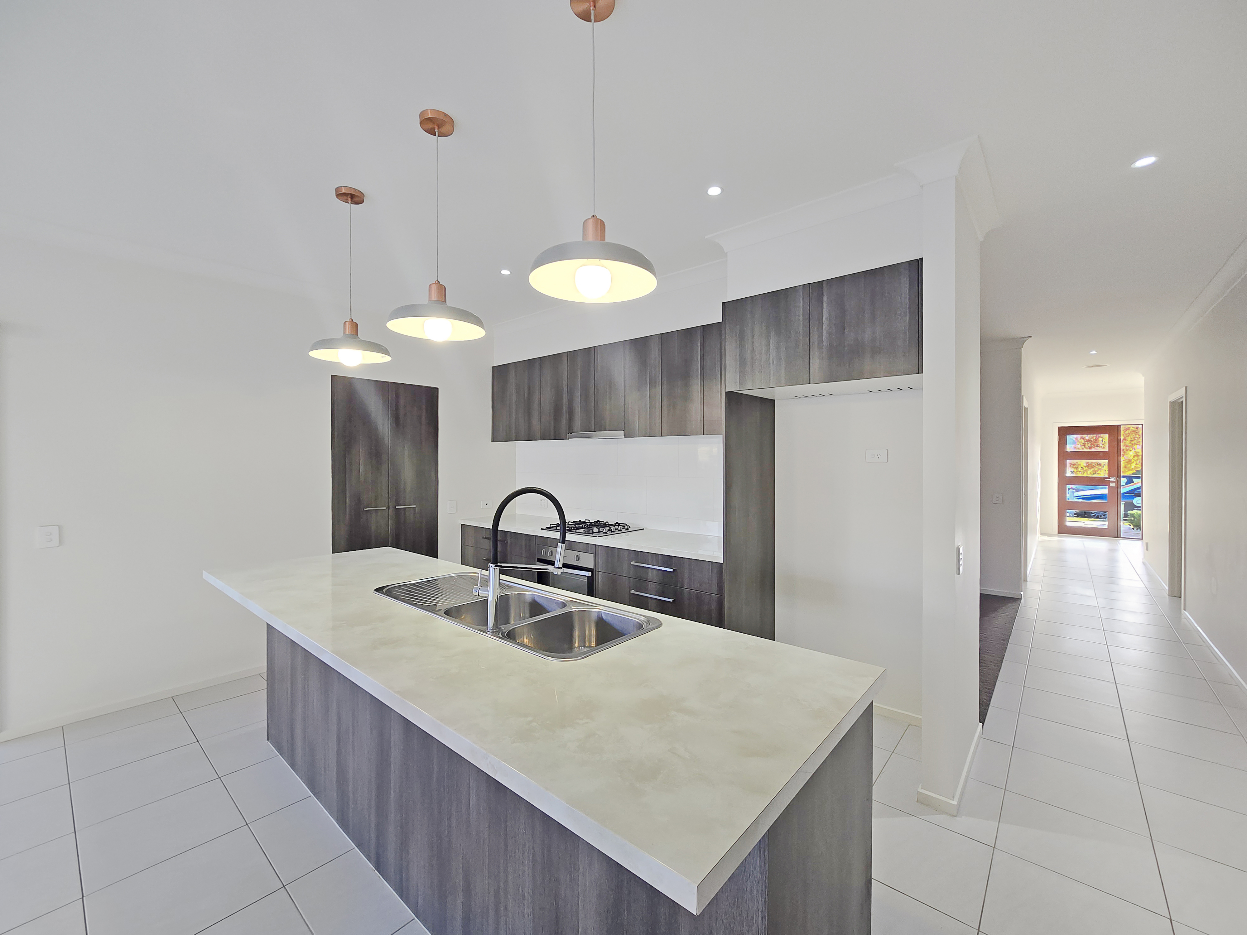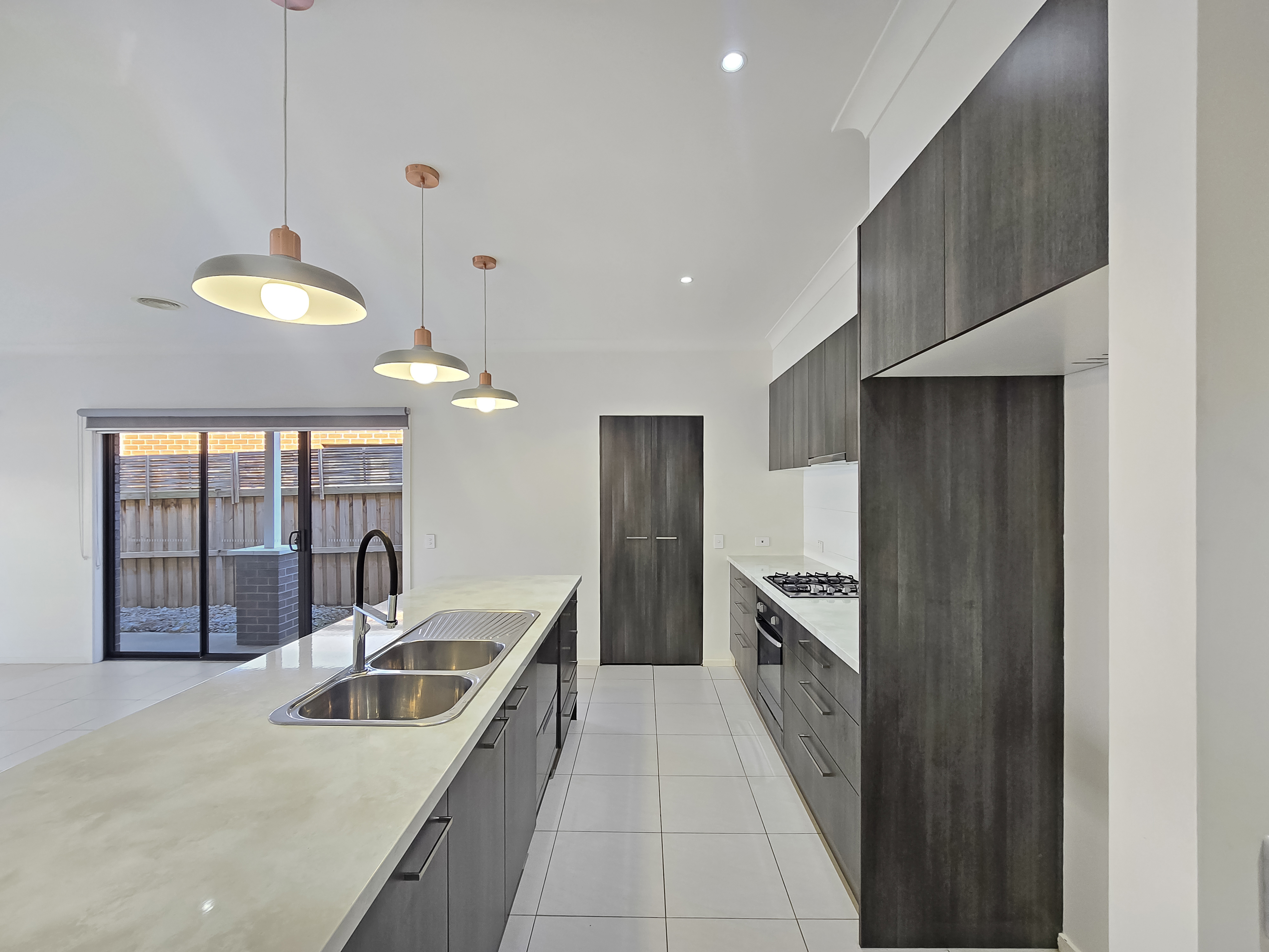 – Kitchen featuring large island bench with pendant lights above, 4 burners stainless steel gas cooktop, 600mm oven, stone bench tops, microwave cavity, plenty of storage, overhead cupboards and built-in pantry