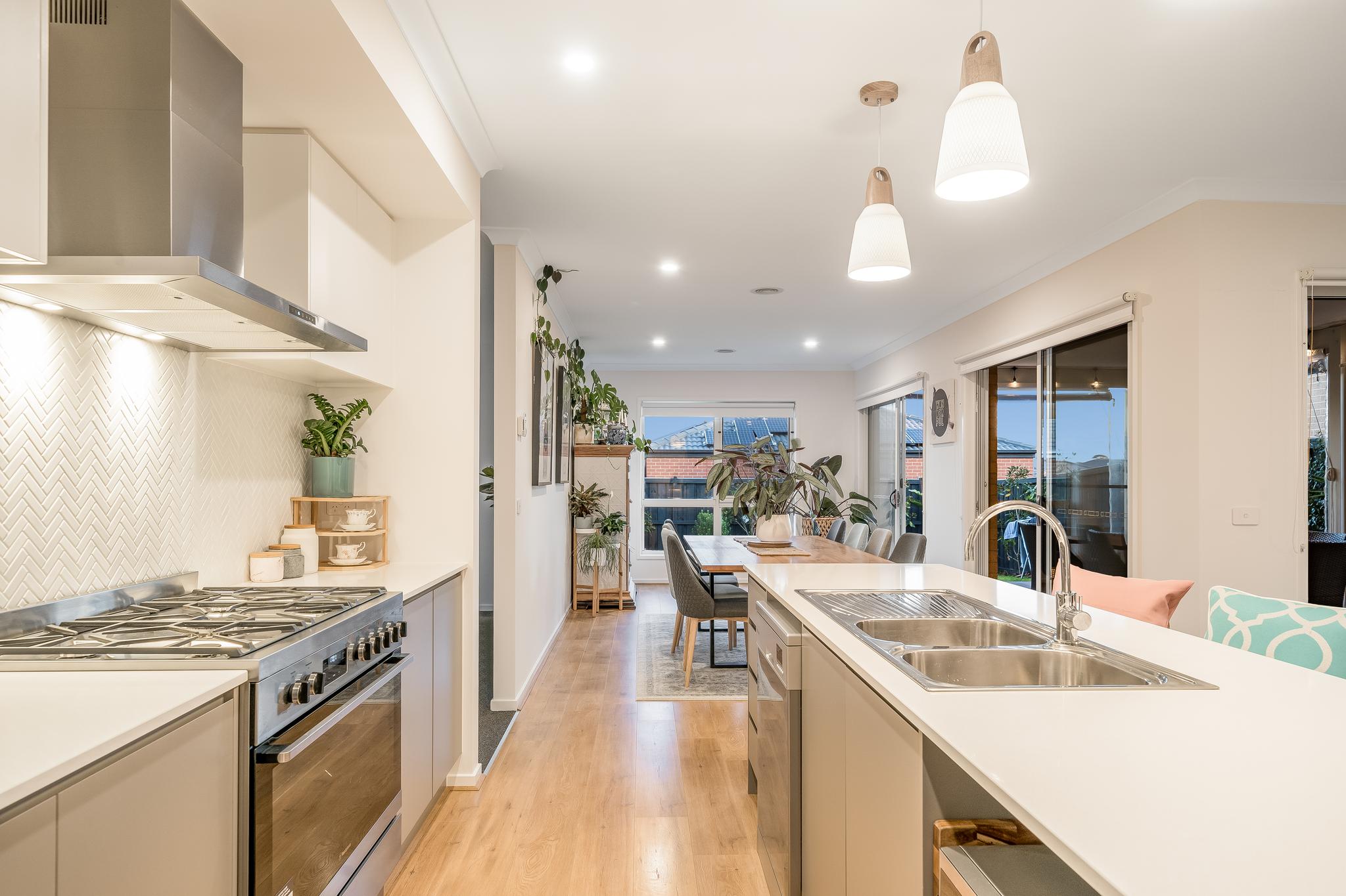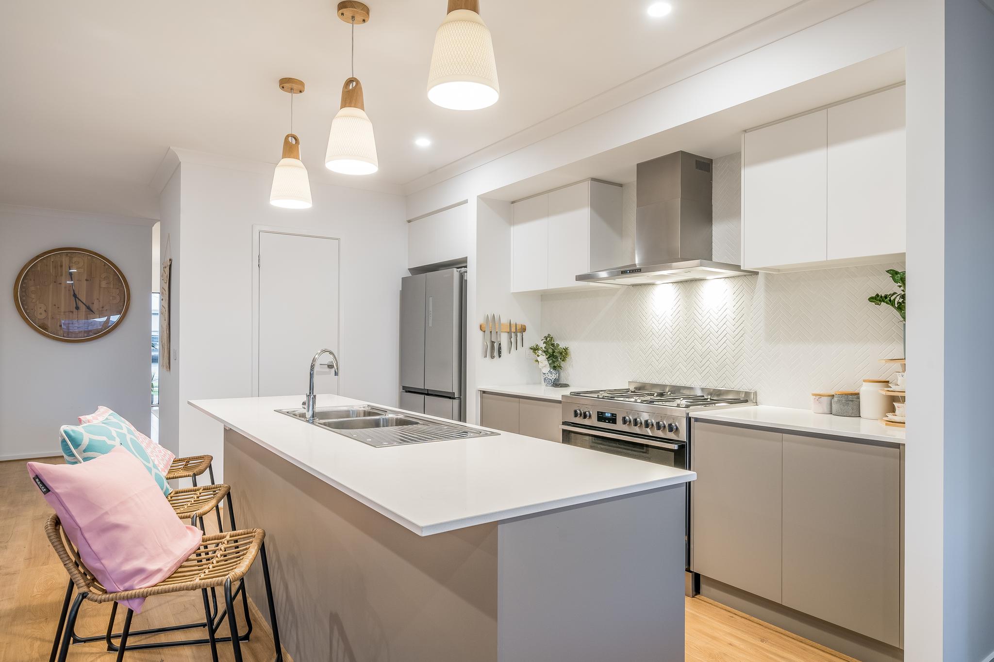 Kitchen: 20mm stone bench, island bench with overhang for breakfast bar, 900mm appliances, feature herring bone tile splash back, generous walk in pantry, chrome fittings, overhead cabinetry, dishwasher, soft close, timber laminate, down lights, pendant lights