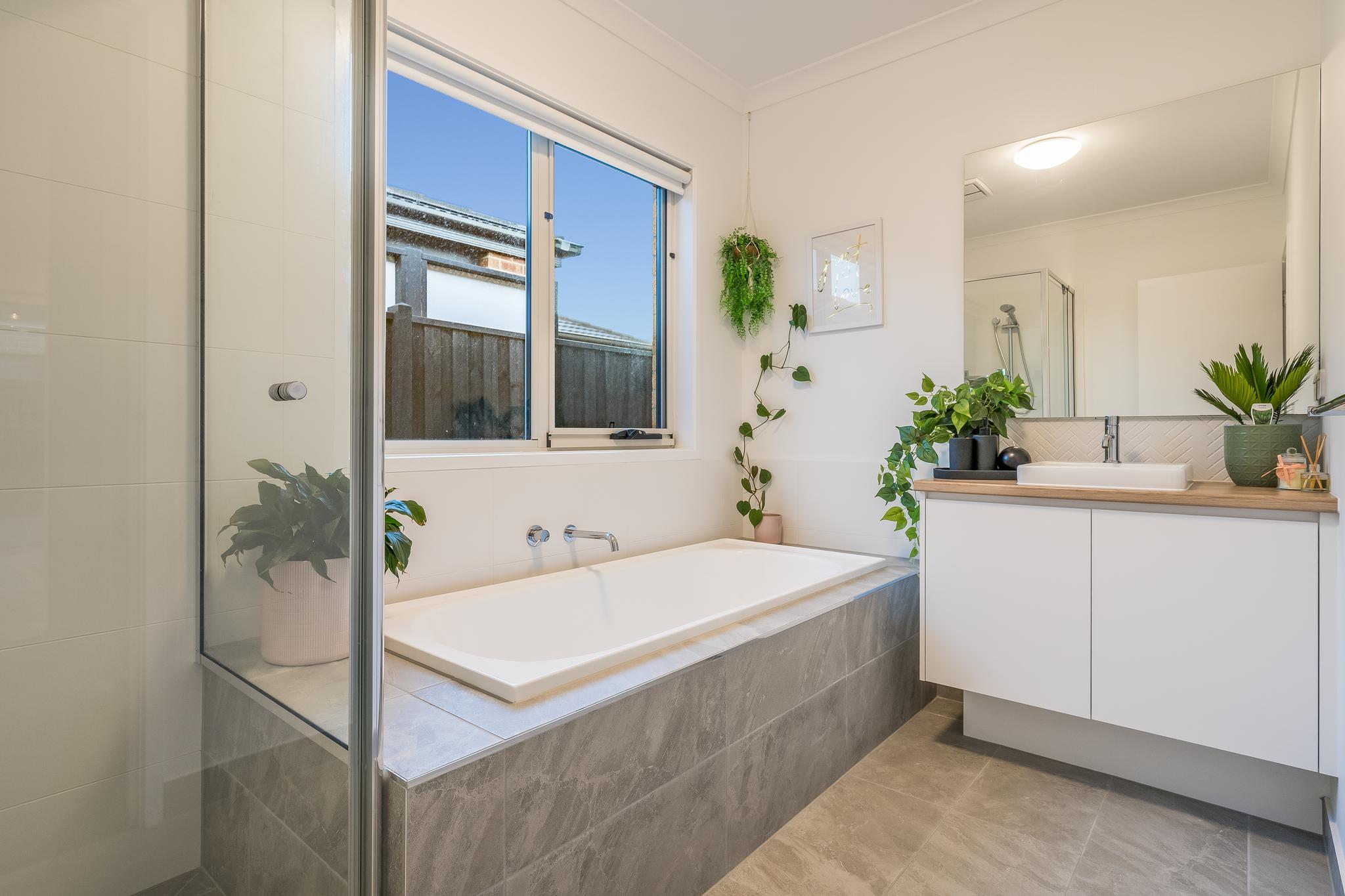 Main bathroom: timber look benchtop, chrome fittings, semi frameless shower, fully tiled shower, hand held shower head, bath, separate toilet