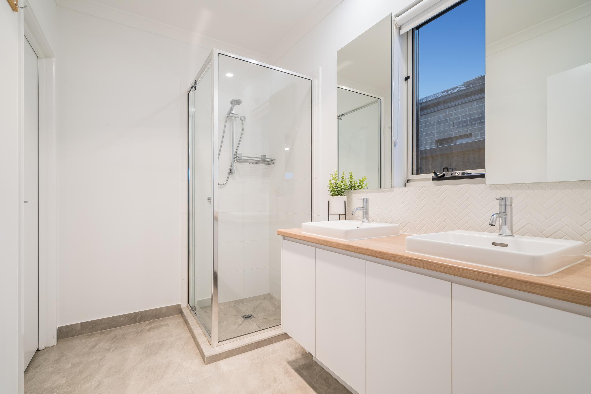 Ensuite: Dual vanity with tile splashback, double mirror, semi-frameless shower, fully tiled shower, seperate toilet, timber look bench top