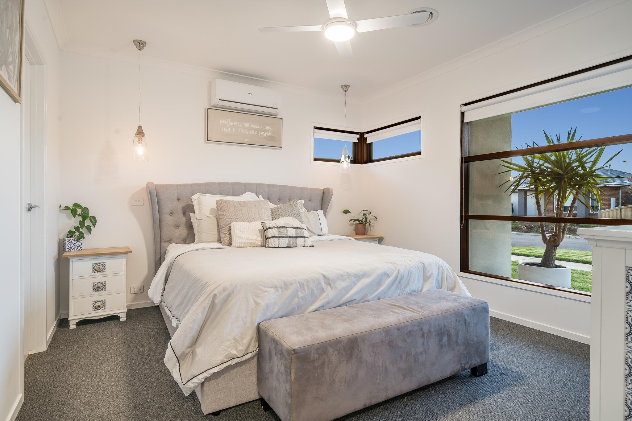 Master suite: Carpet, pendant lights, split system cooling, ducted heating, horizontal corner feature window with roller blinds, north-facing for natural light, ceiling fan with light, walk in robe
