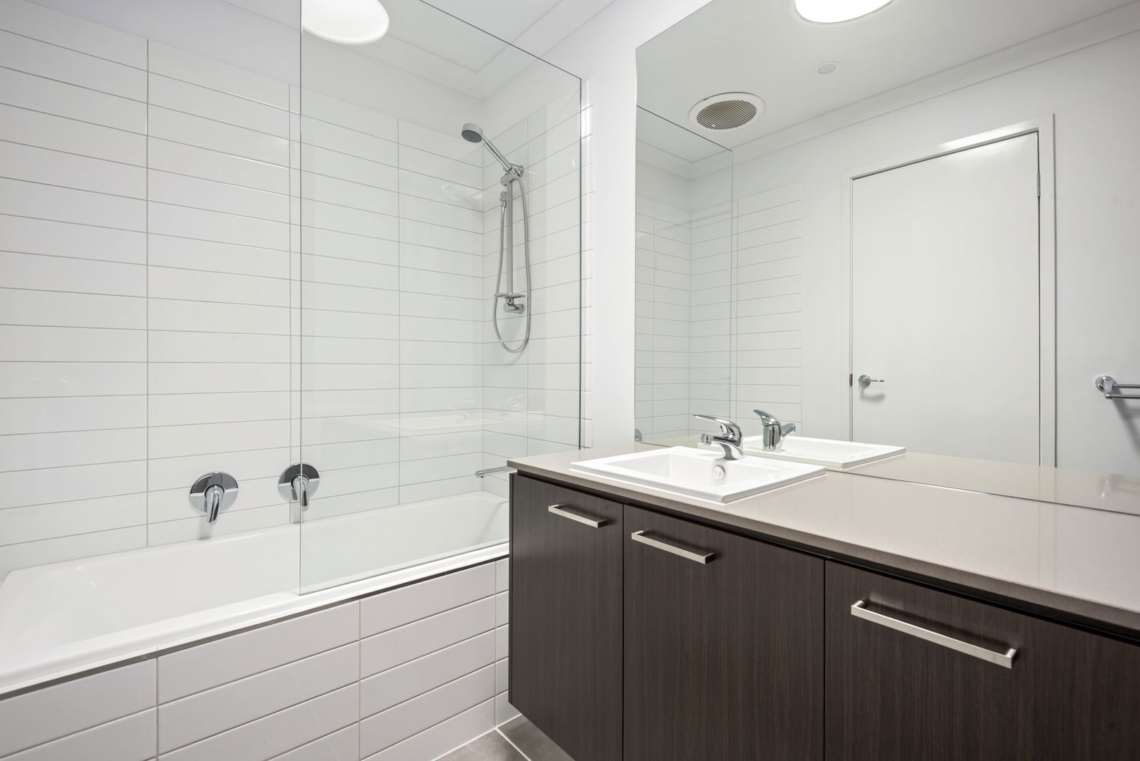– Bathroom with a shower-over-bath, vanity and a toilet