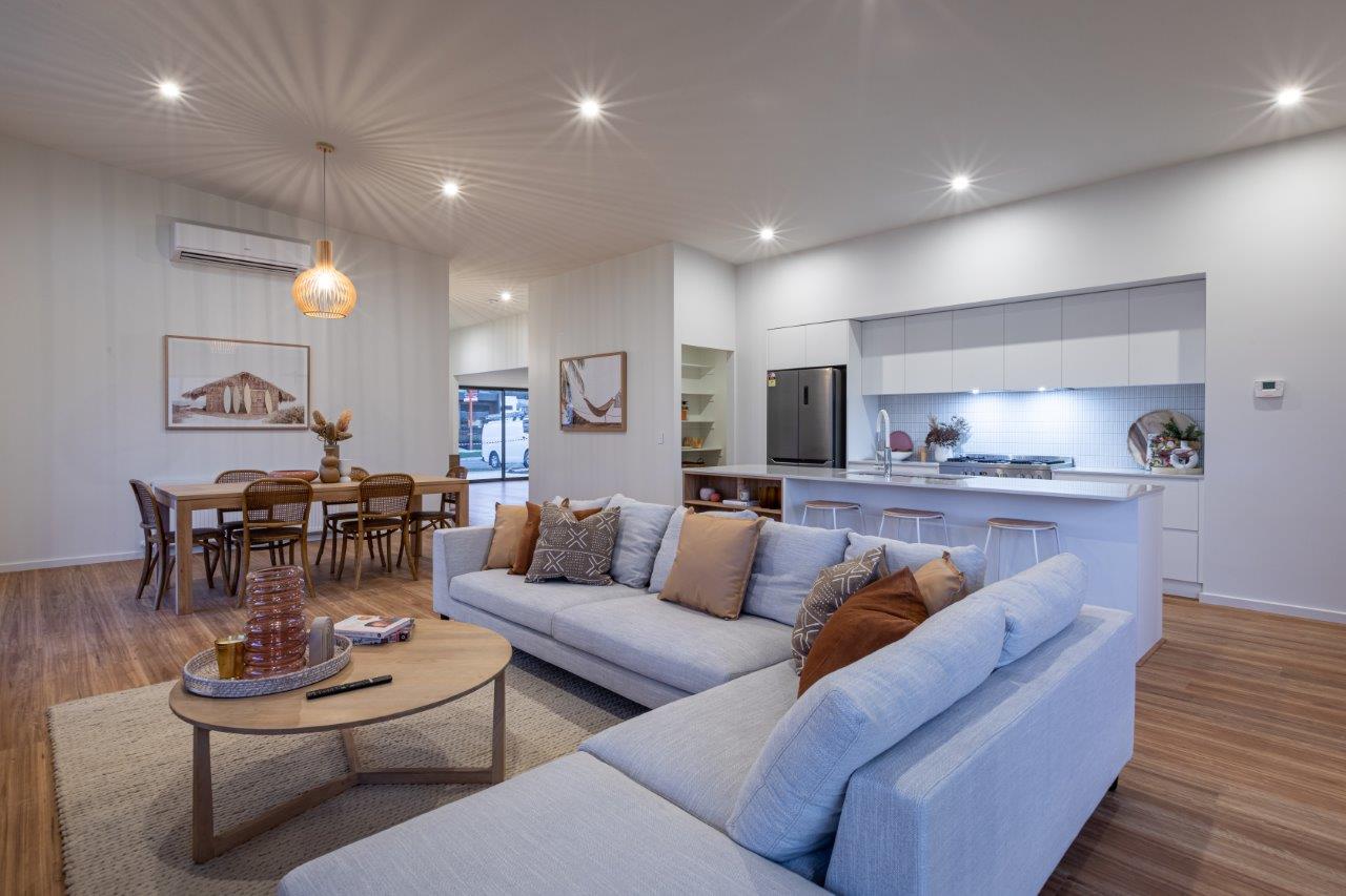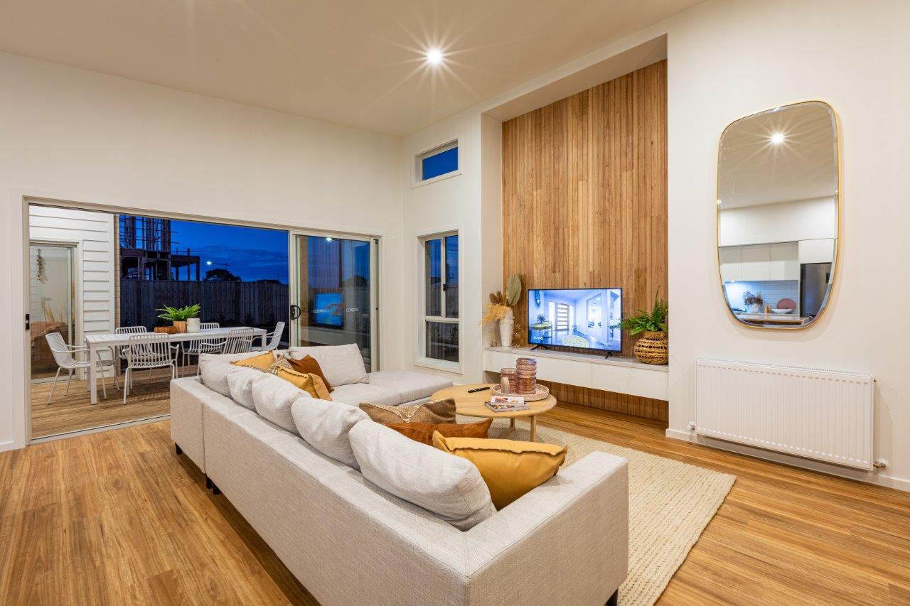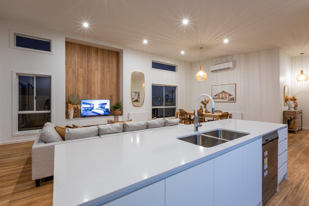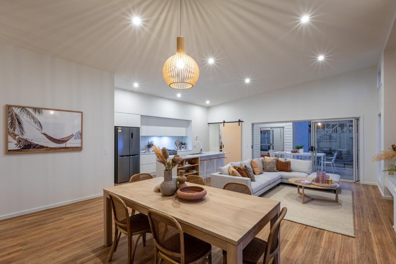 Living: Open plan kitchen/ living/ dining, vinyl flooring, downlights & feature pendant light, TV nook with 40mm stone bench top & cabinetry in-built, feature battenclad vertical blackbutt to rear wall, down lights, stacker door opening up to alfresco