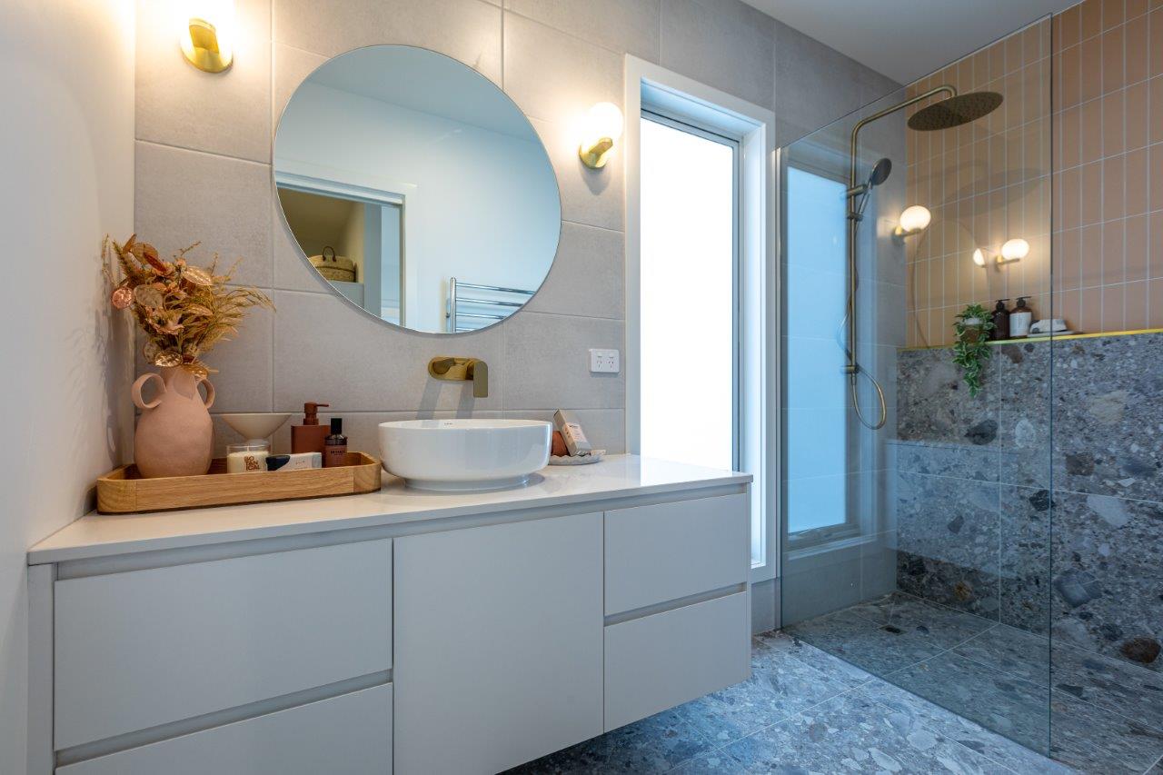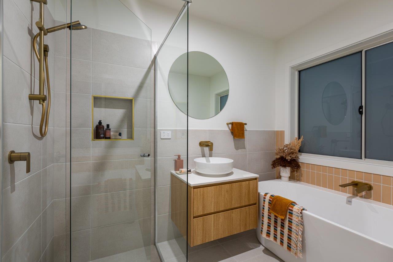 Main bathroom: tiled, bath, vanity with feature basin, 900×900 shower & separate toilet