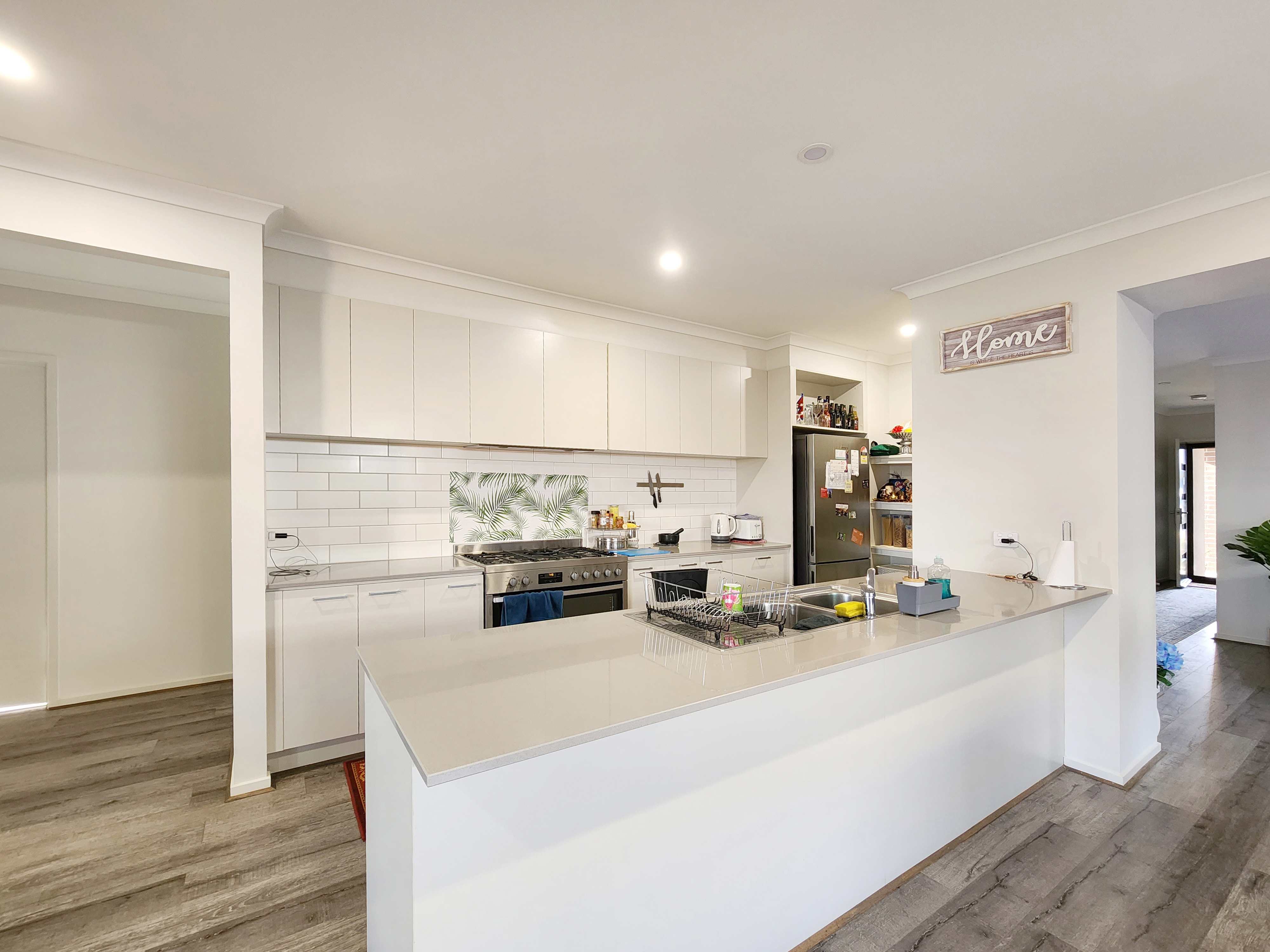 – Kitchen and dining area with stone bench tops, stainless steel appliances and walk in pantry with ample shelving