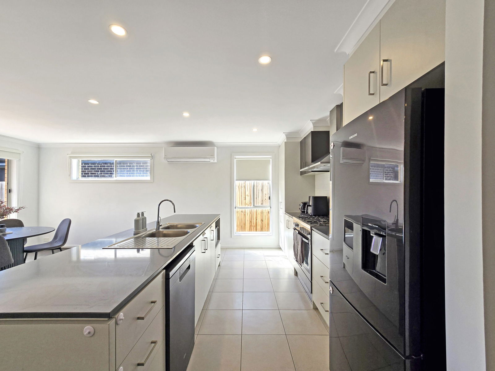 Kitchen – Open plan kitchen, 20mm stone benchtops with breakfast bar overhang to the island, double basin sink, chrome fittings, downlights, power points throughout, stylish oven with stainless steel stovetop and rangehood, ducted heating, built-in pantry, tiled splashback and flooring.
