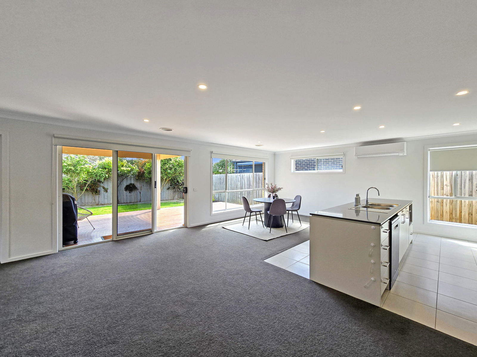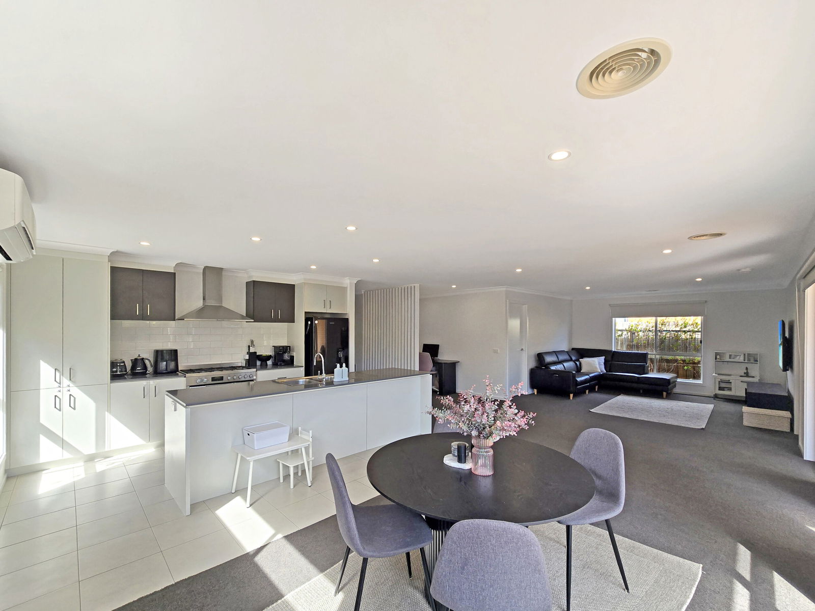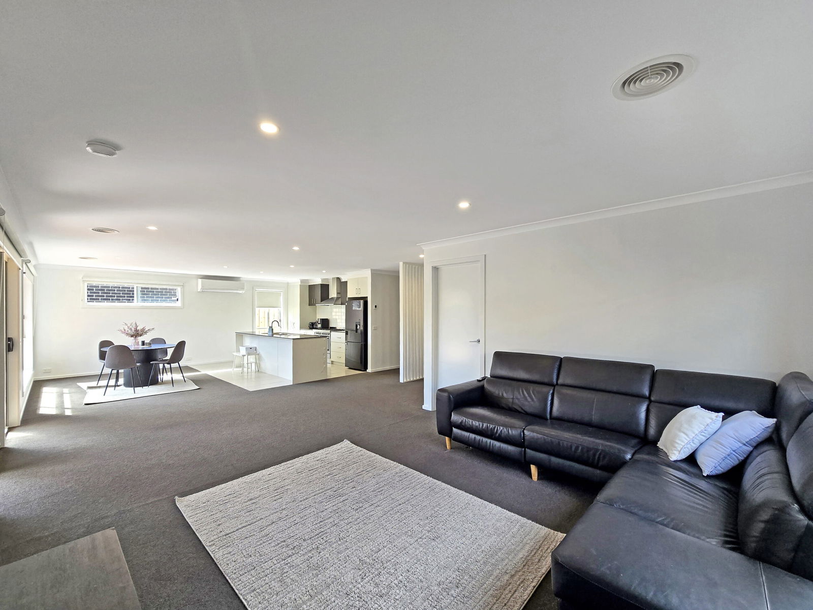 Dining – Large open plan kitchen/living/dining area with wide windows with roller blinds and glass sliding doors through to the undercover outdoor living space, downlights, ducted heating, split system air conditioning and heating, carpeted.