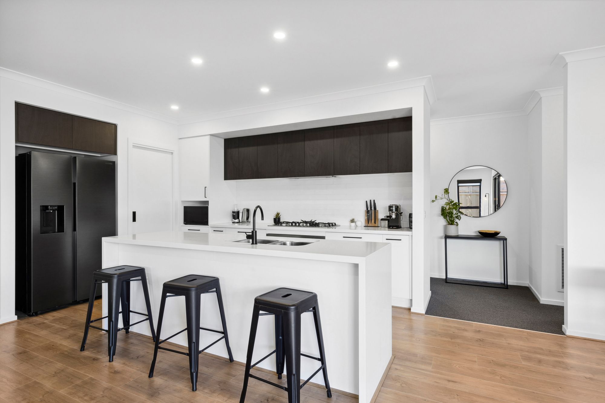 – Kitchen featuring 40mm stone bench tops, 900mm stainless steel appliances, dishwasher, microwave cavity, beautiful cabinetry and large walk in pantry