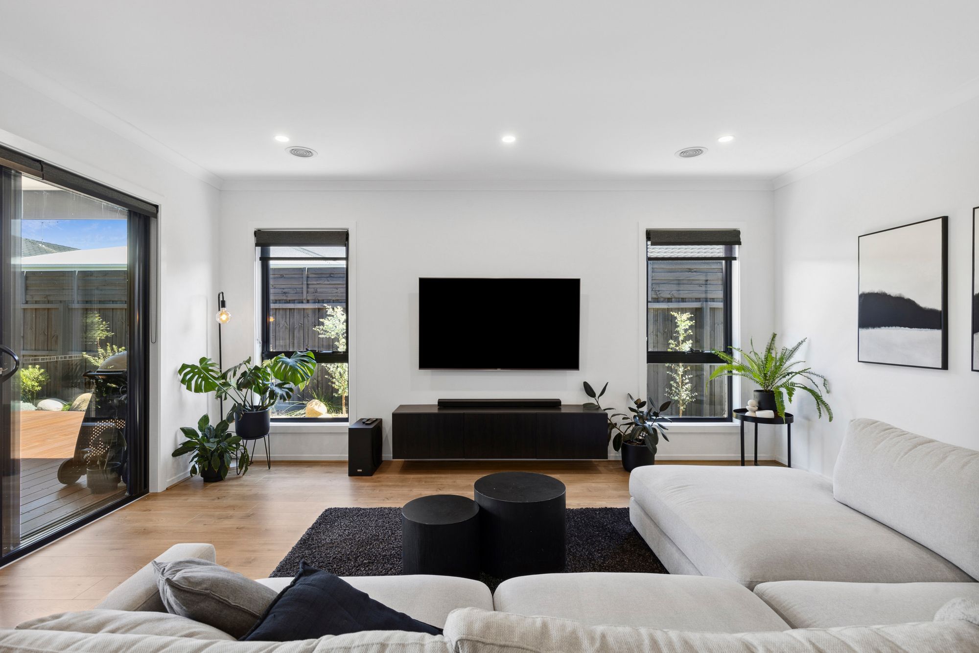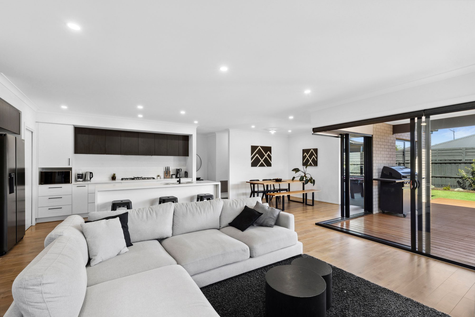 – Pillar-less sliding stacker doors from lounge to a decked entertainment alfresco