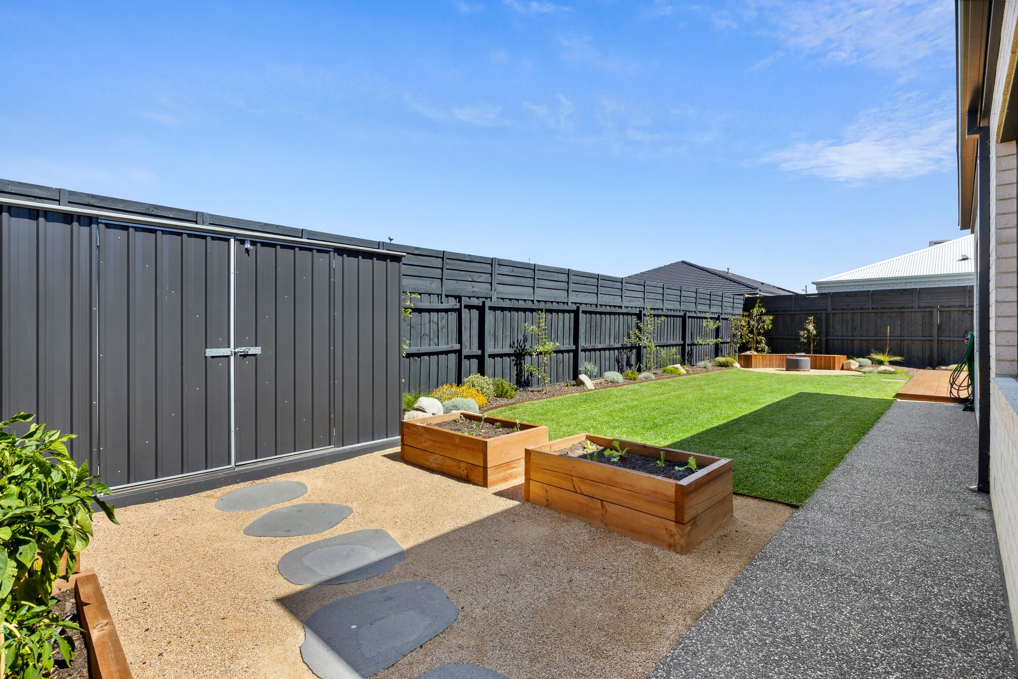 – Fully fenced yard with large grassed area and fire pit space and garden shed