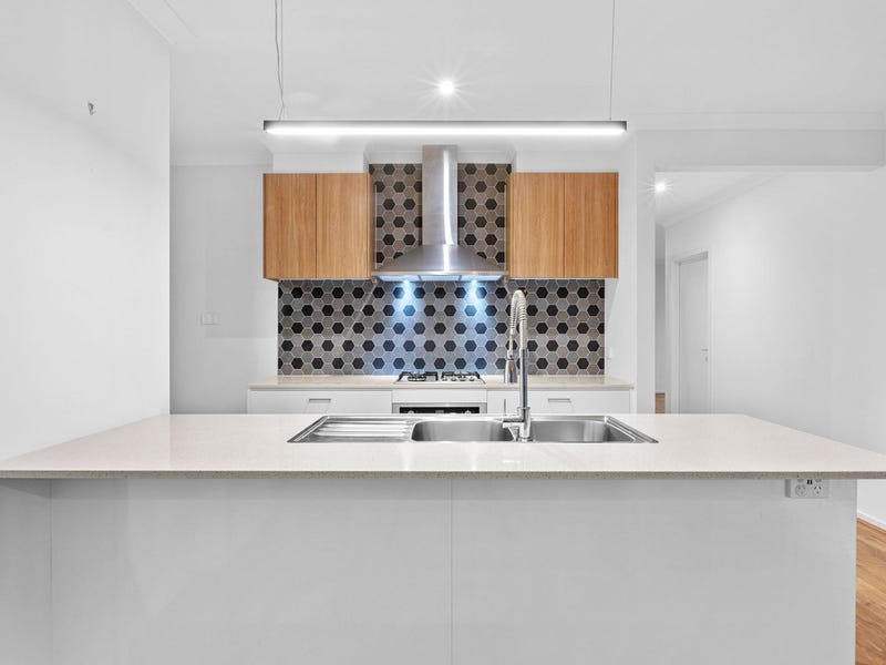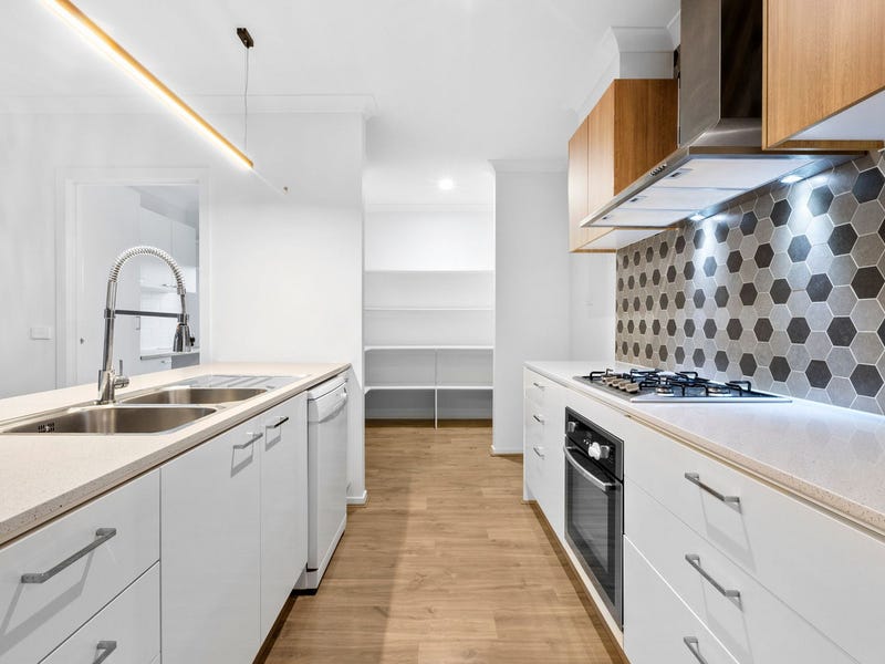 – Kitchen featuring grey hexagon tiled splashback, in-built oven and walk in panty