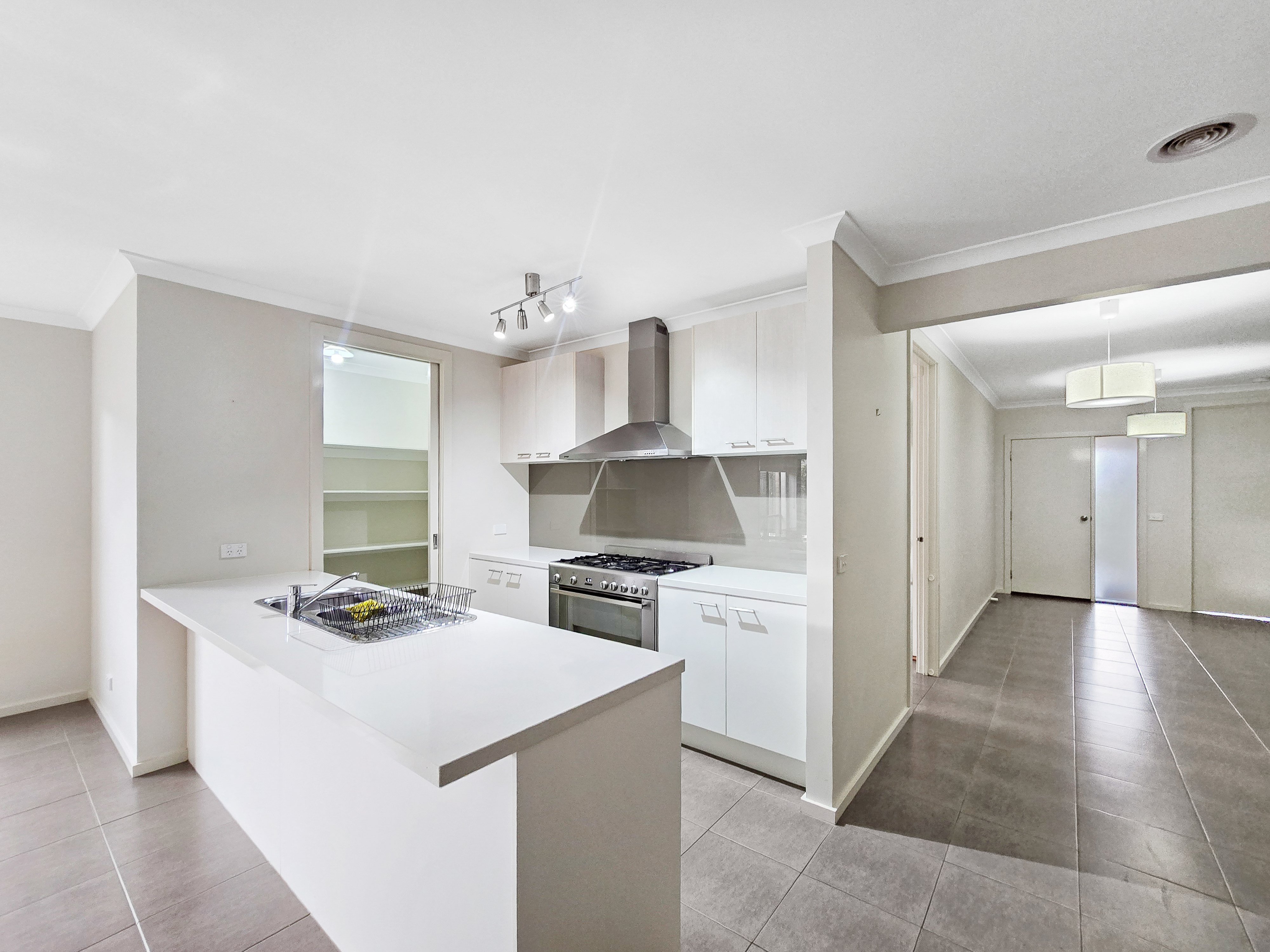 – Modern kitchen with stone bench-tops, 900mm oven and 5 burner gas cook-top, dishwasher, plenty of cupboards & drawers, and a large walk-in pantry