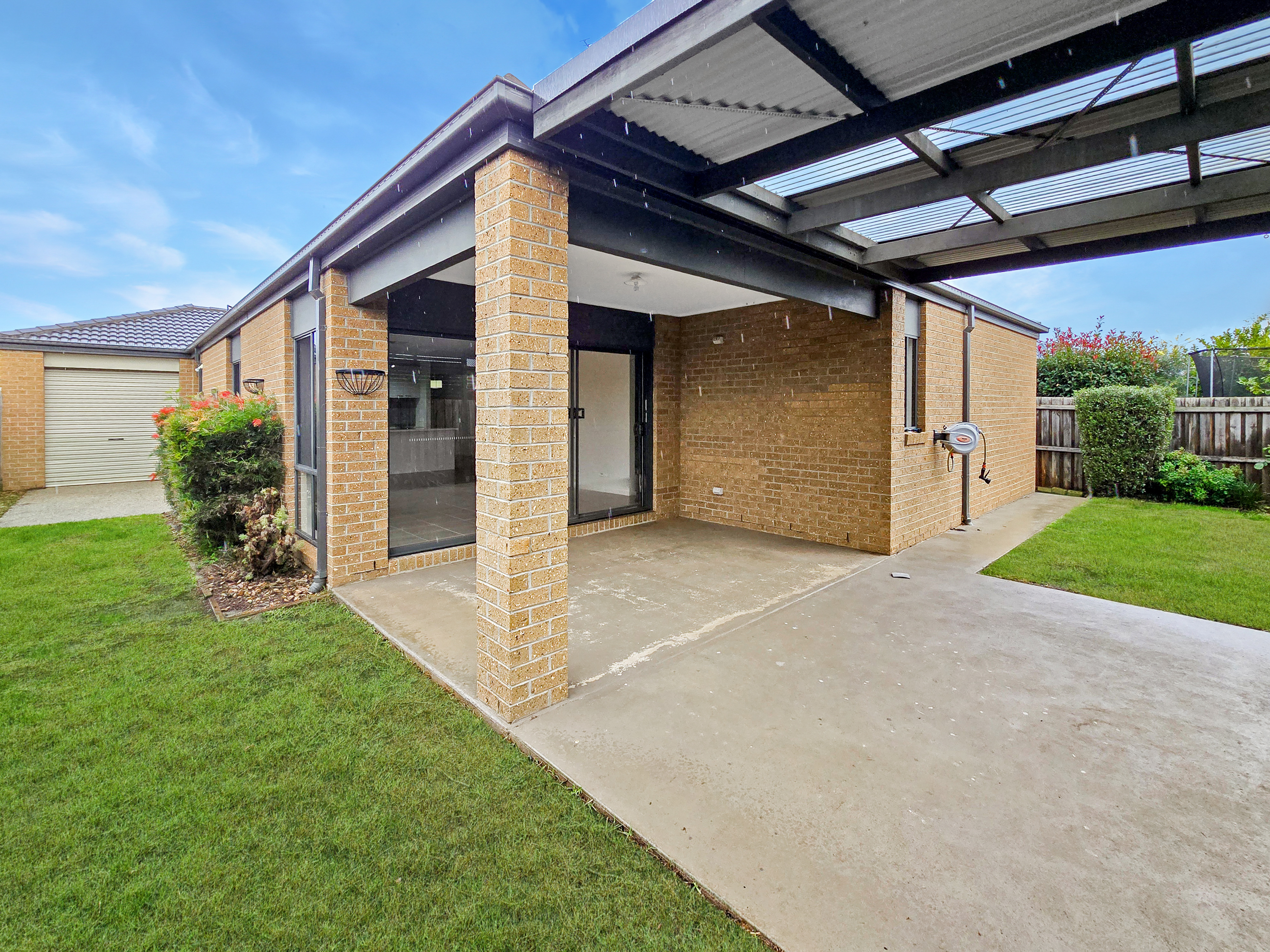 – Low-maintenance backyard with plenty of grass, clotheslines and garden hose installed