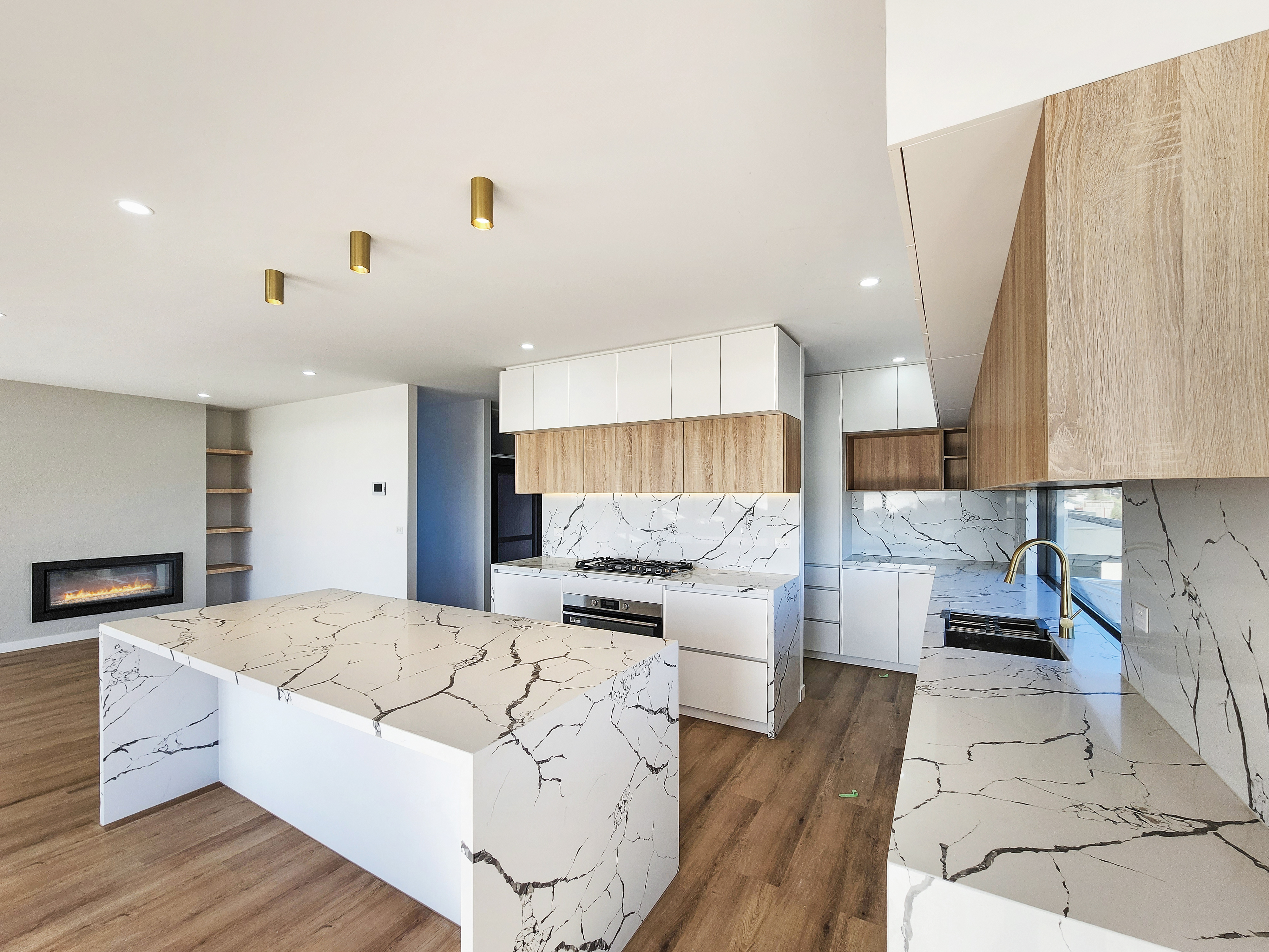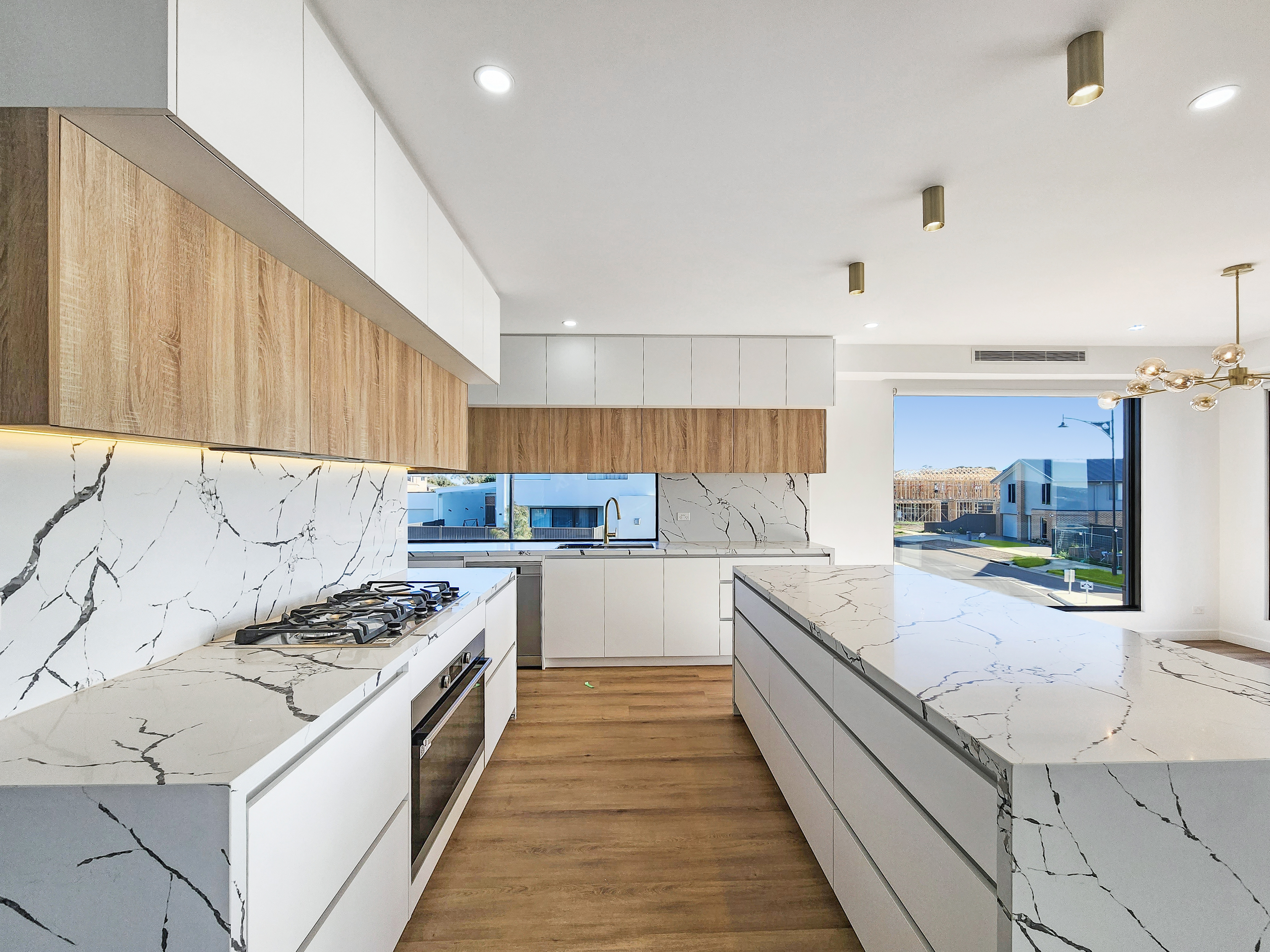 – Grand kitchen including stunning unique waterfall bench tops, walk in pantry with cabinetry, under-mount sink, plenty of cupboards & pot drawers, quality appliances such as 900mm stainless steel oven, 5 burner gas cook-top and dishwasher.