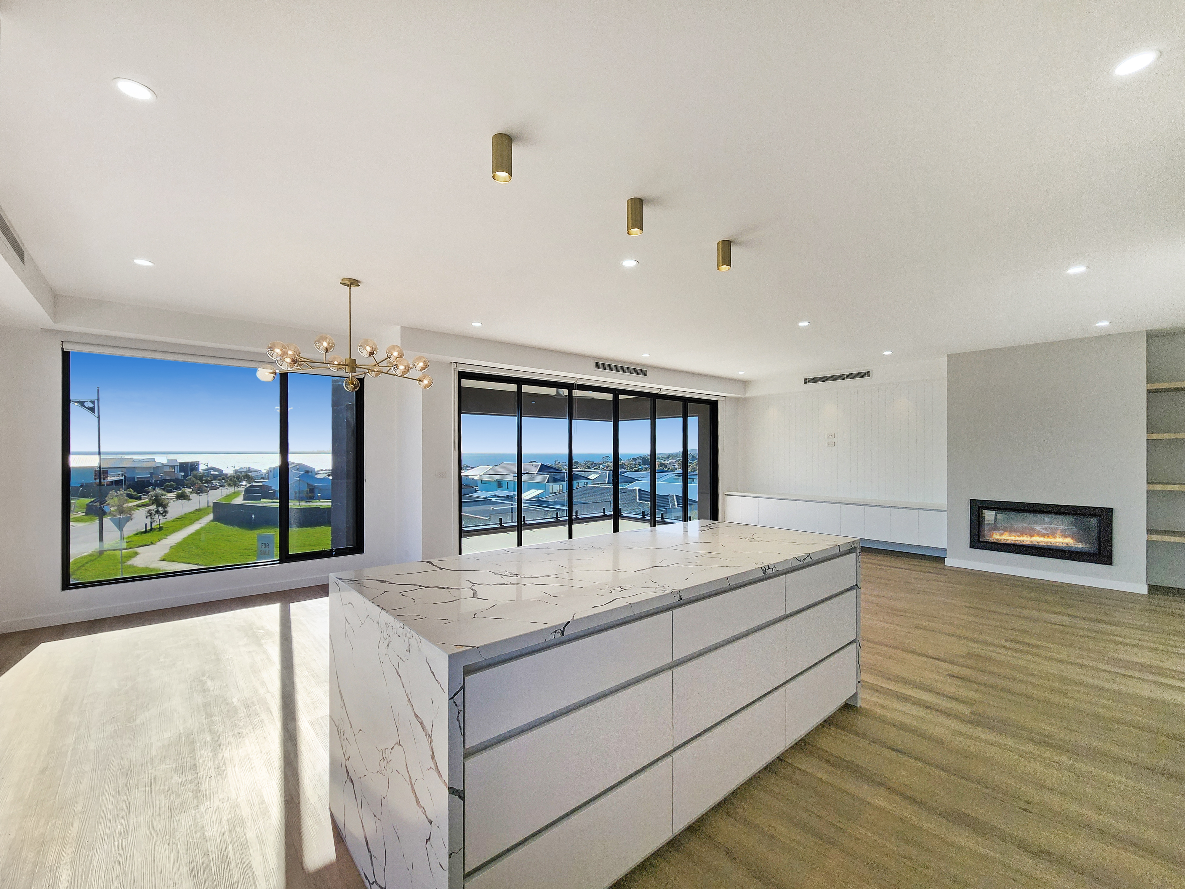 – Floor to ceiling doors and windows offer exceptional views of the bay and cozy up on the couch with the feature fireplace in the living space
