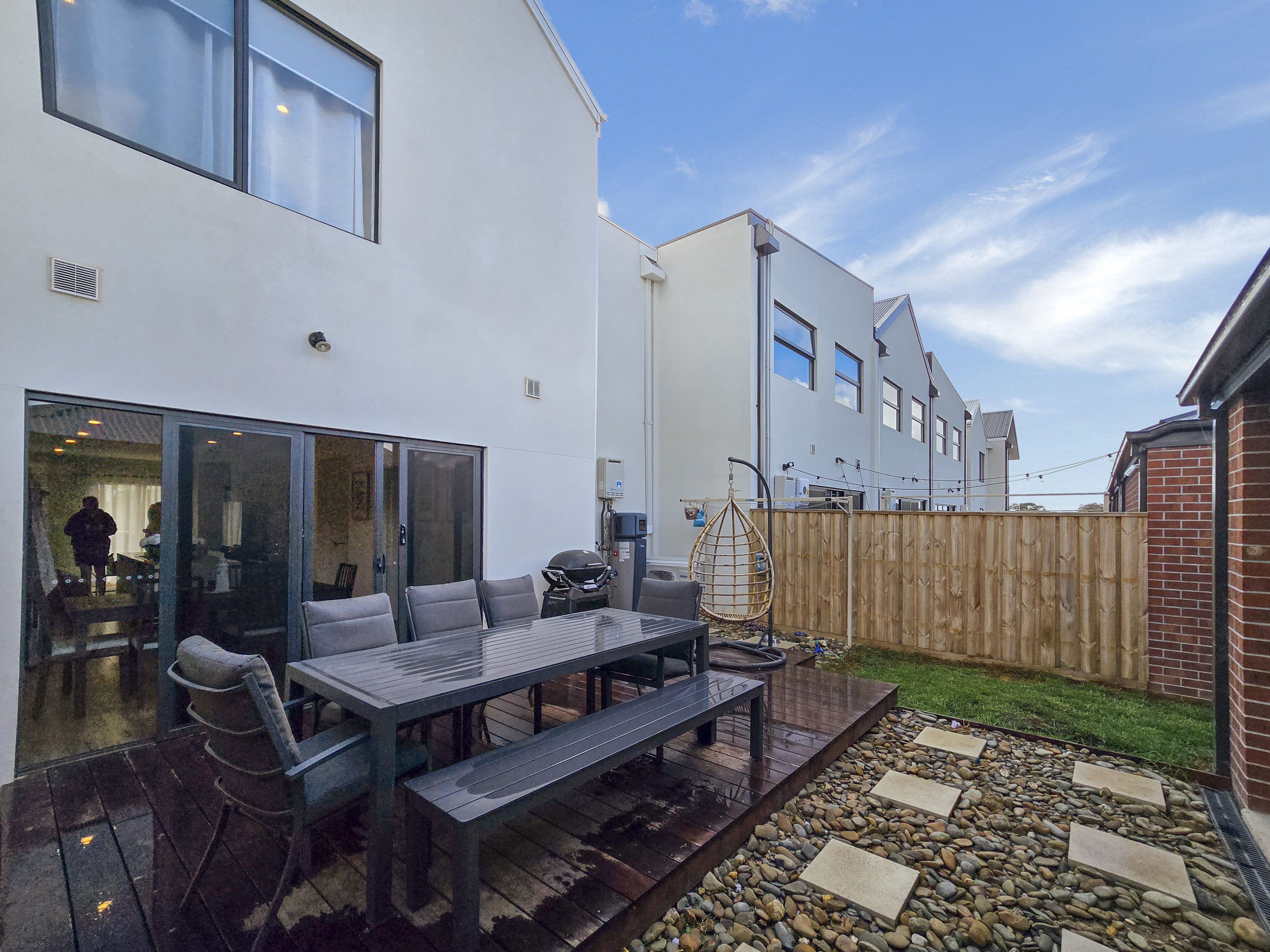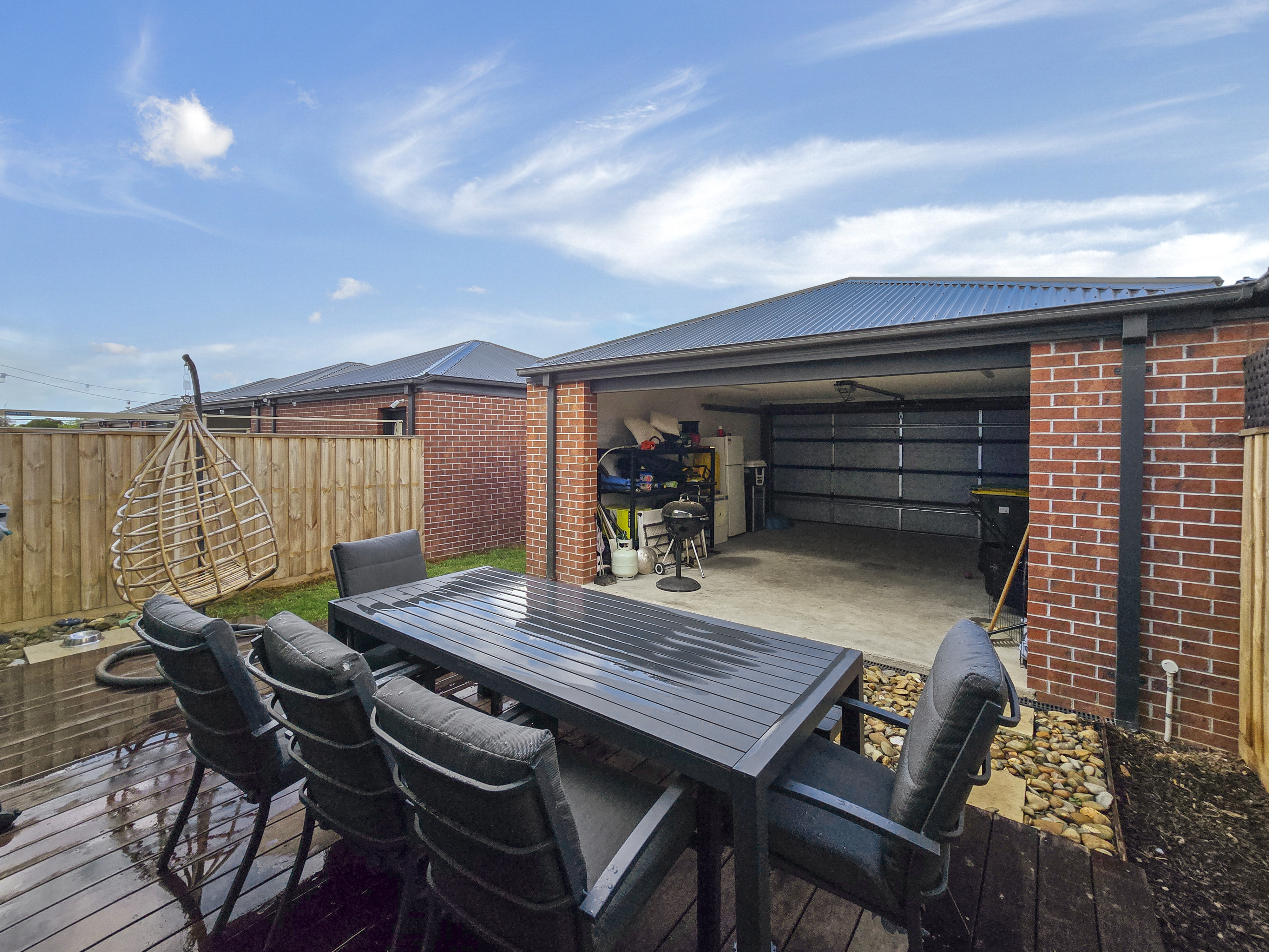 – Low-maintenance backyard with decked outdoor space, grass, clothesline installed
