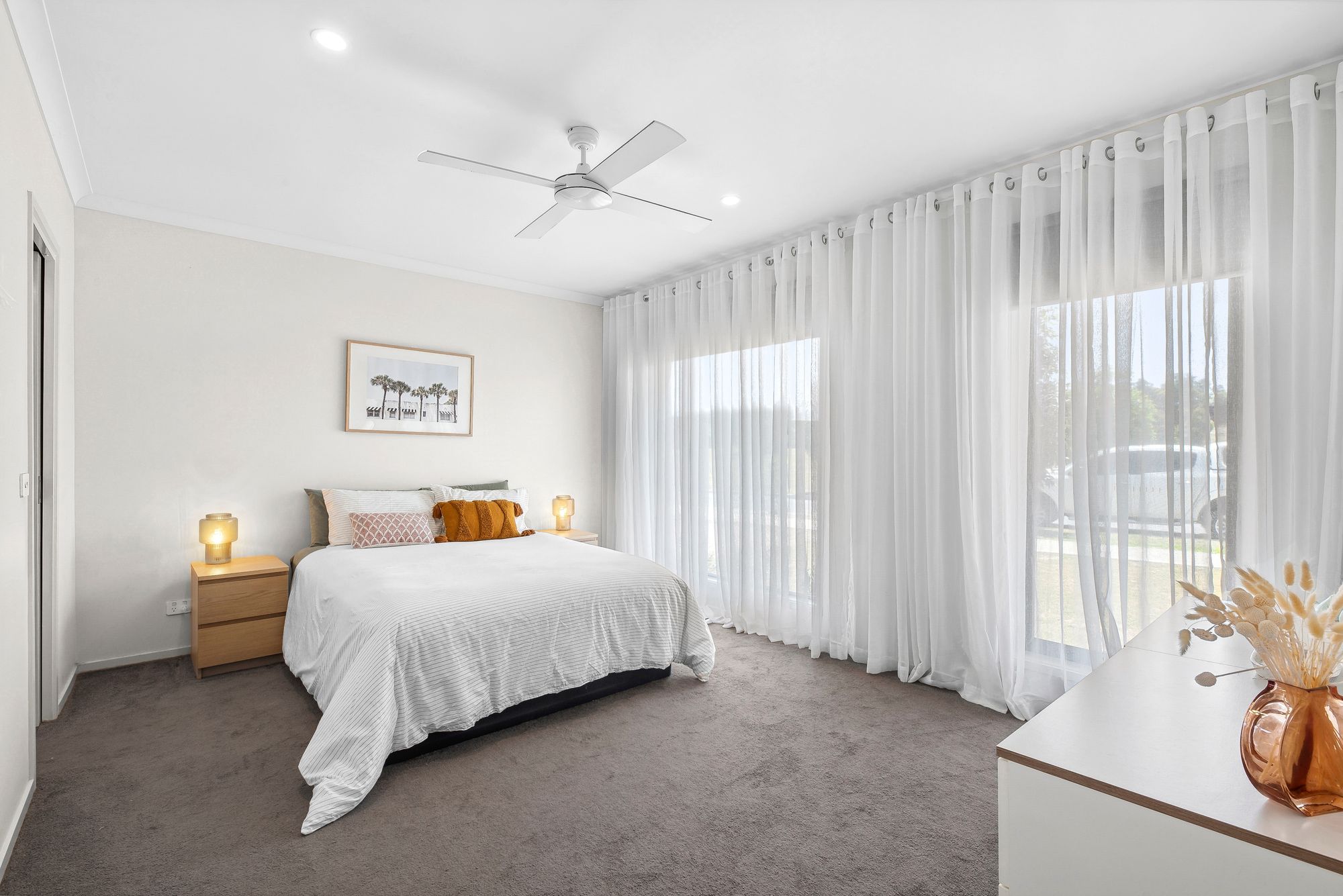 Master Suite: large windows with sheer curtains, roller blinds, ducted heating, ceiling fan, carpet flooring