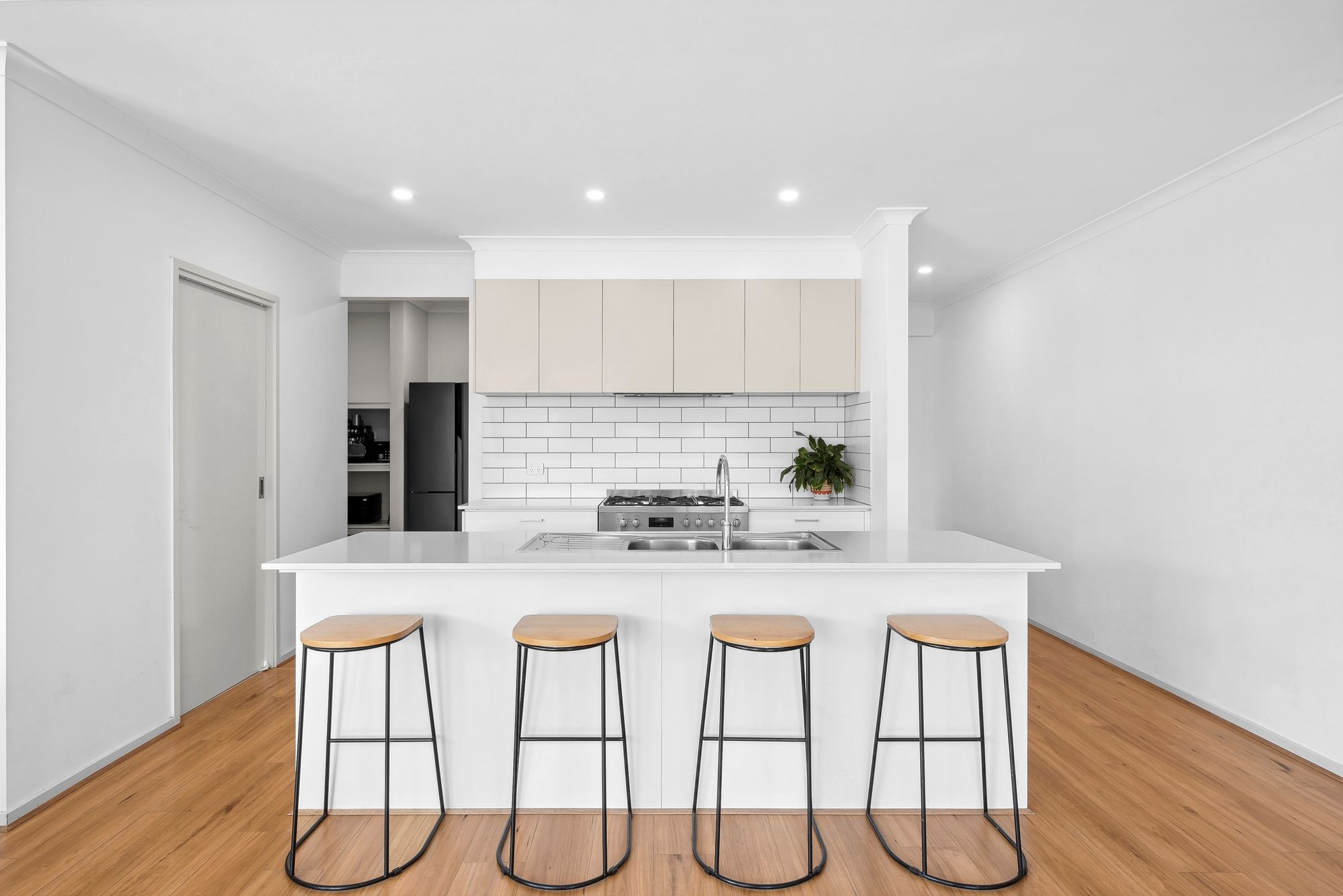 Kitchen: downlights, 900mm stainless steel gas cooktop, oven & rangehood, walk in pantry, 20mm stone benchtops, double sink, overhead cabinetry, storage drawers, subway tile splash back, timber laminate floorboards, island bench with overhang breakfast bar, microwave provision & dishwasher.