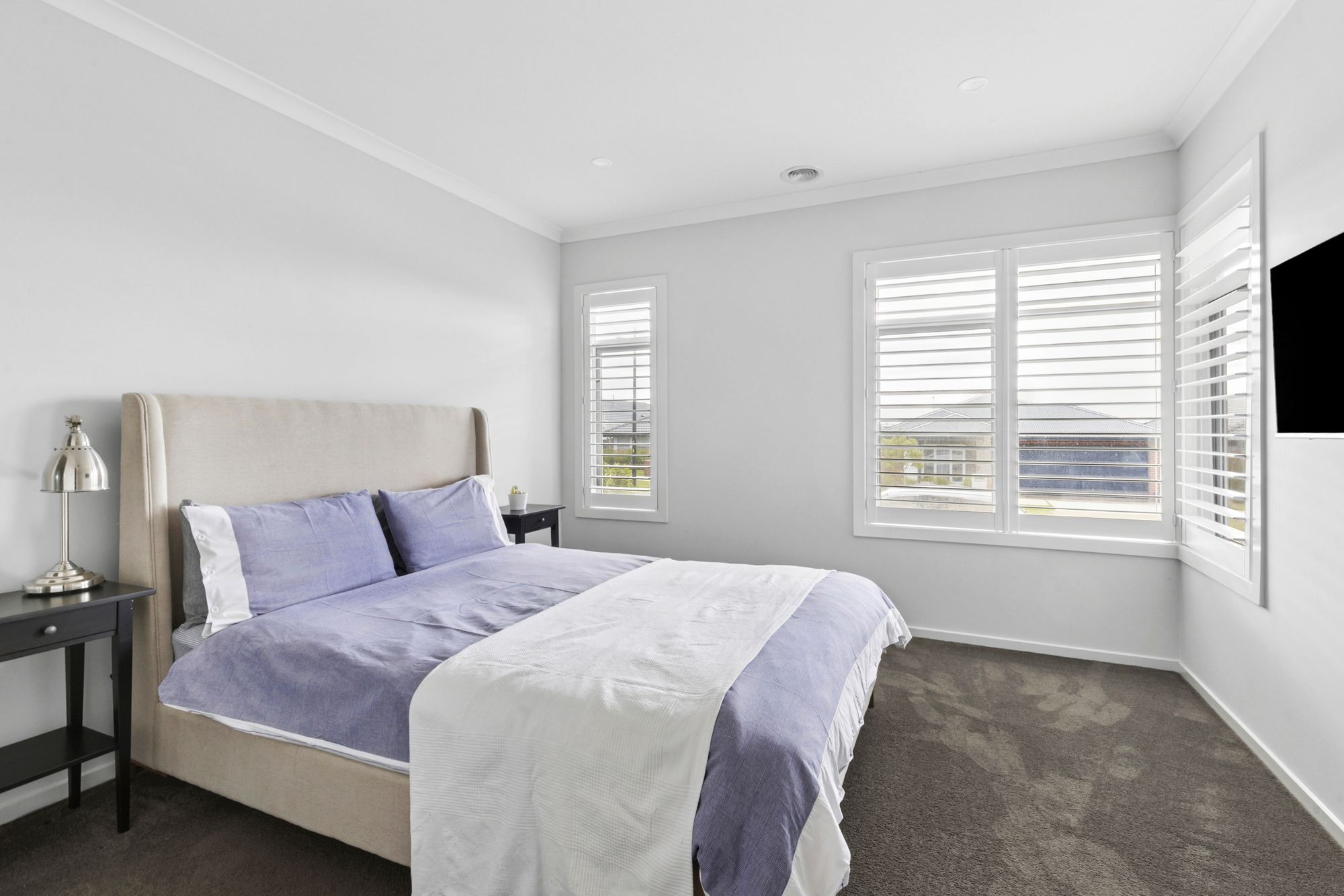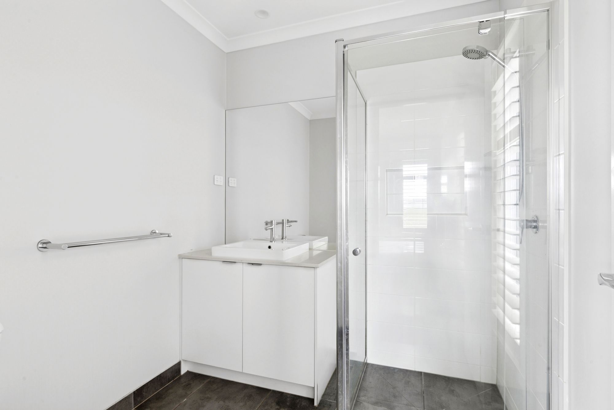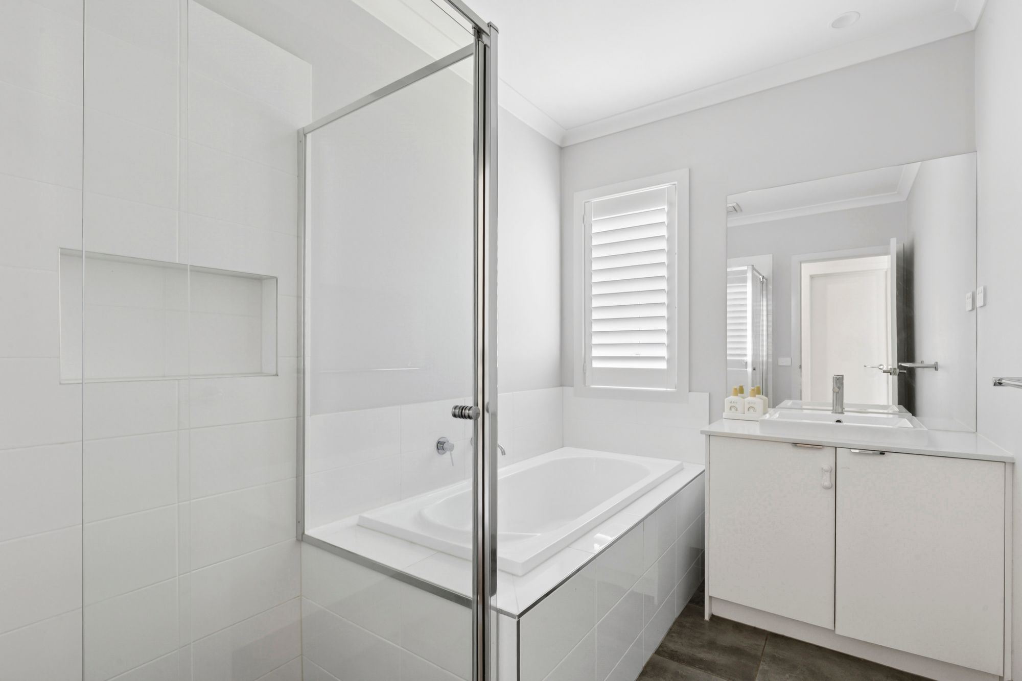 Master Suite: Generously sized and situated at the front of the home, it showcases a spacious walk-in robe and elegant ensuite. Complete with downlights, North-facing windows accompanied by plantation shutters, ducted heating and evaporative cooling, creating a comfortable space year-round. The neutral coloured ensuite consists of a tiled shower with niche and wall-mounted/handheld showerhead, single basin on a 20mm stone benchtop vanity with a mirrored splashback, window with plantation shutters.